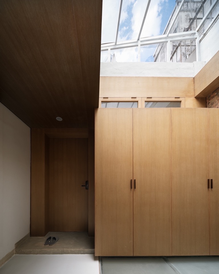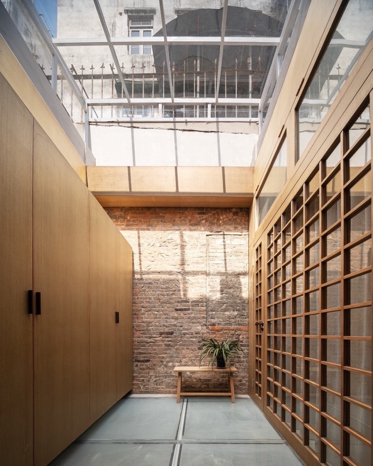 Xiguan is largely constructed over rice polders at the former Pearl River estuary. Ground water is a mere meter from the surface. Together with a compact urban environment, managing humidity and light is front of mind.Spaces within the long but narrow footprint are organized around three lightwells. A central lightwell separates the front and back apartments on the second floor. It is a communal area that buffers the two apartments and houses communal washing machines and storage. The screen door of the front apartment can swing into the courtyard space, expropriating the common space for an expanded interior when needed. A glass floor allows light to drive into the centre of the workshop below.