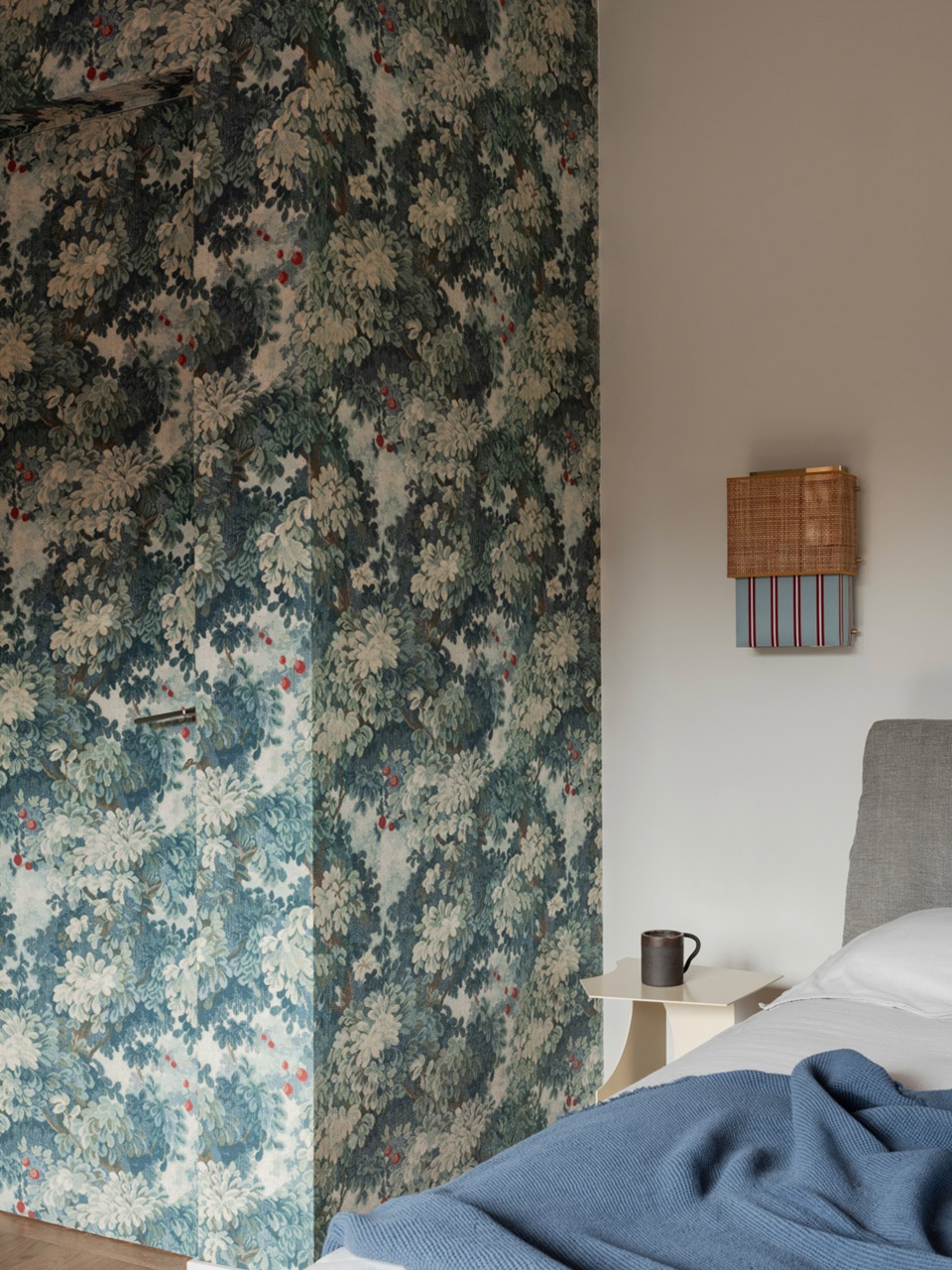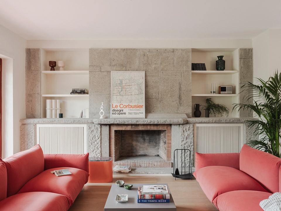 入口处设有定制衣柜,柜体内衬L’Opificio出品的 “Viceversa Monet” 布料,并以优雅的坦干伊喀胡桃木(Tanganika walnut)收边,体现出STUDIOTAMAT对工艺与细节的极致关注,也反映了其“精致而恒久”的设计理念。原有的山毛榉木门窗被修复,保留了别墅的历史神韵,深化了其与过去的精神联系。在客厅与餐厅区域,修复后的石制壁炉自然融入石墙之中,营造出温馨而宜人的社交与休憩氛围。
