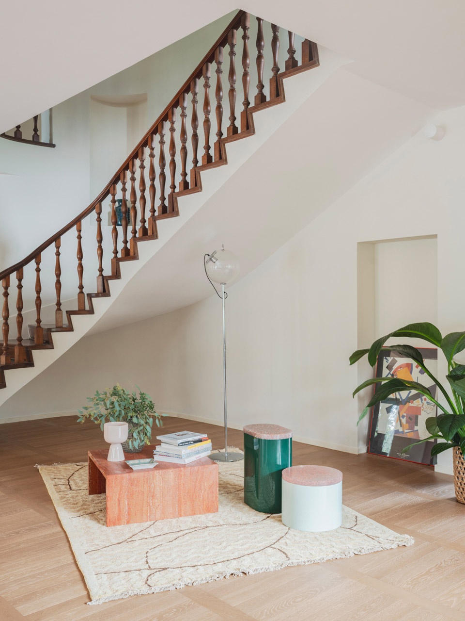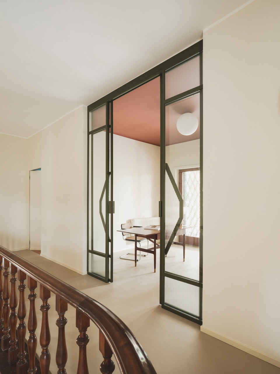 The furniture, selected to reflect the owners’ eclectic personalities, blends vintage pieces with design icons. In the living room, 1970s Marenco sofas by Arflex pair with Rammendi pouf/coffee table by Punto Zero and Plastiz, while Marcel Breuer’s Cesca chairs by Knoll complete the dining room alongside a special edition table from Punto Zero’s “Big” collection. The table’s high-gloss lacquered finish and custom color amplify the room’s natural light, delicately reflecting its surroundings. Upstairs, the oak parquet floors laid in a “sister” pattern connect the bedrooms, each overlooking the main staircase and joined by a continuous cream-colored resin path. At the center, Sara’s study, with its custom glass wall and large window overlooking the main terrace, serves as a sanctuary of light and inspiration, made cozy by a Tuscan Red-painted ceiling from Little Greene.