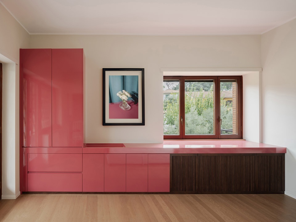 “在改造过程中,我们特别强调了那些原有的建筑细节,它们也启发了部分定制家具的设计。例如厨房的窗框与Sara楼上的书房,都采用了菱形中轴图案,呼应别墅中保留下来的1950年代铁艺装饰。这是一种平衡的艺术:这座房子同时提供了激发灵感与放松心绪的空间。”STUDIOTAMAT 联合创始人Matteo Soddu解释道。
