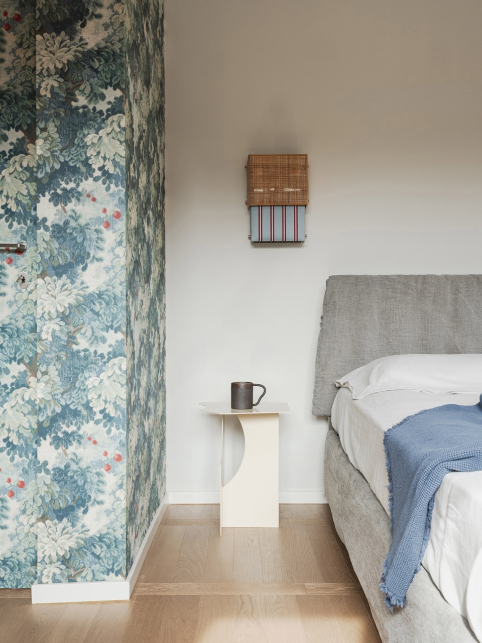 家具的选择体现了屋主兼具理性与感性的个性,将复古与当代设计相融合。客厅内,Arflex 1970年代的Marenco沙发搭配Punto Zero与Plastiz出品的Rammendi坐墩与茶几;餐厅中,Knoll的Marcel Breuer设计 “Cesca” 椅环绕于Punto Zero“Big” 系列限量版餐桌周围。这张高光漆面定制色桌面强化了自然光的反射,使空间在明暗交替中更显轻盈。楼上,橡木人字拼地板以“姐妹花纹”铺设,串联卧室与主楼梯,整体以柔和的奶油色树脂地面贯通。居中的Sara书房以定制玻璃隔墙与大窗引入露台景观,天花以Little Greene出品的托斯卡纳红饰,为光影空间增添温度。