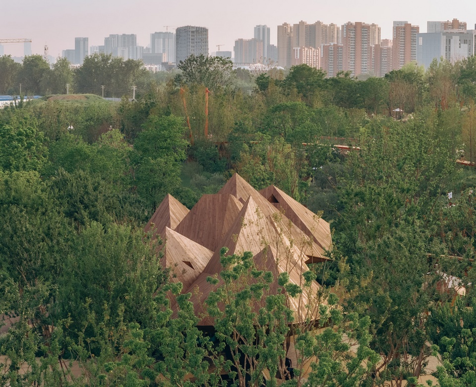 As one of the first standalone buildings to open on LuxeIsland, this building serves as a showcase for the LuxeIsland. Accordingly, the layout gently curves and extends along the island’s shoreline, while the building’s height was designed with so much mass that it remains visible from across the river through the gaps in the foliage. As visitors walk across the open lawn and weave through the woodland, gradually approaching the building, the “little mountain” stands out prominently, inviting them to explore further.