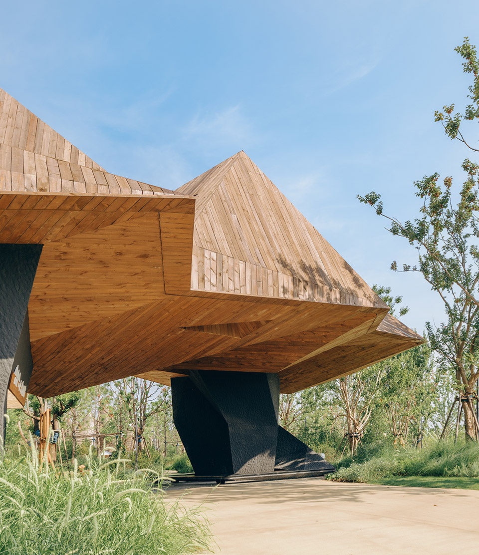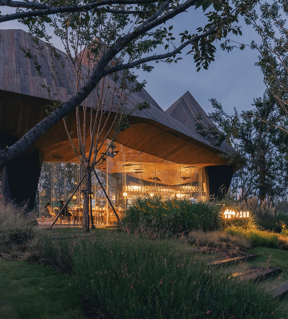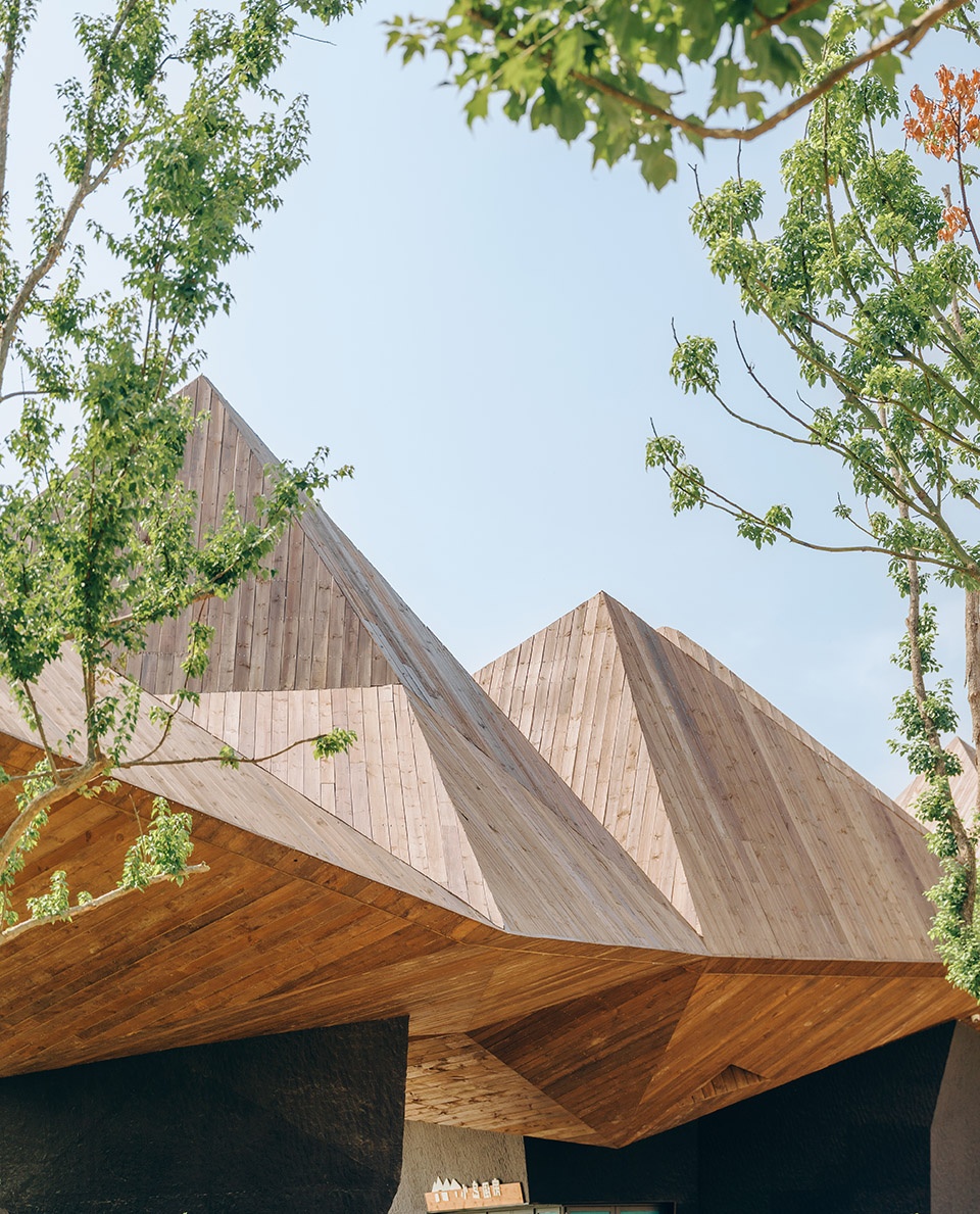 To make the layered, mountain-like roof appear as though it is leaping up from the ground, the main structure of the building is supported by four clusters of composite steel columns. These columns are clad in black stone panels, with parts of the cladding extended to form functional features such as outdoor seating, takeout counters, and wash stations. The roof adopts a steel space frame structure to achieve long spans and cantilevers. Its entire exterior is clad in solid wood strips, which are interspersed with triangular openings that also house indoor lighting and air conditioning vents. Large equipment, such as kitchen and HVAC systems, is entirely concealed within the roof structure.