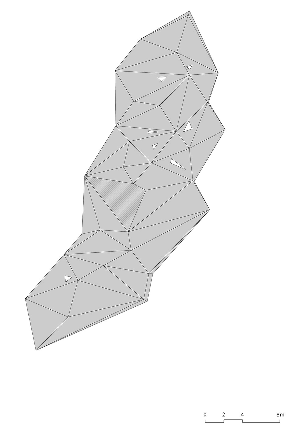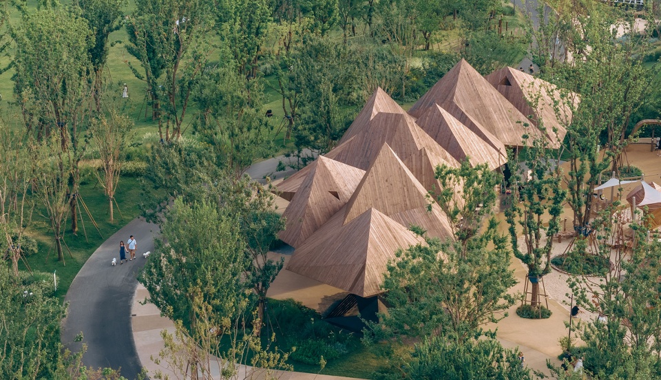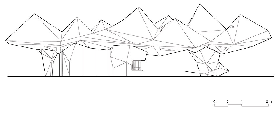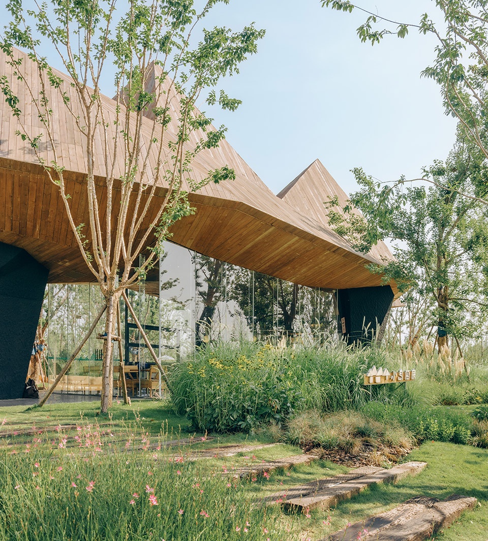 To make the layered, mountain-like roof appear as though it is leaping up from the ground, the main structure of the building is supported by four clusters of composite steel columns. These columns are clad in black stone panels, with parts of the cladding extended to form functional features such as outdoor seating, takeout counters, and wash stations. The roof adopts a steel space frame structure to achieve long spans and cantilevers. Its entire exterior is clad in solid wood strips, which are interspersed with triangular openings that also house indoor lighting and air conditioning vents. Large equipment, such as kitchen and HVAC systems, is entirely concealed within the roof structure.