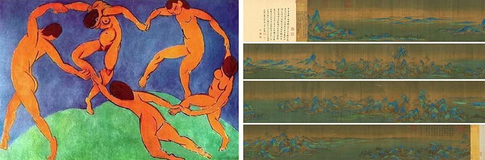 ▼Henri Matisse《Dance》(左)&王希孟《千里江山图》(右),Henri Matisse《Dance》(left) and Wang Ximeng’s “A Thousand Miles of Rivers and Mountains” (right) © 网络