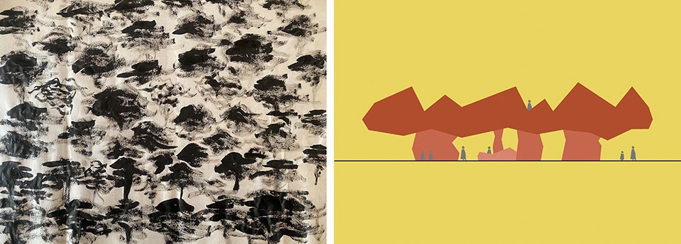 而如何让小山跳起舞来呢?想起两张画,一张是马蒂斯在40岁时画的《舞蹈》,另一张是王希孟18岁画的《千里江山图》,试着捕捉其中的生命力和少年意气。造型模仿也好,气韵意会也罢,总之要转化到建筑空间上,多次尝试后,我和徐丹分别画了张画,我用毛笔画了个母题,规律叠加渐变后似树林似山峦似云彩;在这基础上徐丹直接用色块画出了有空间尺度的形体。