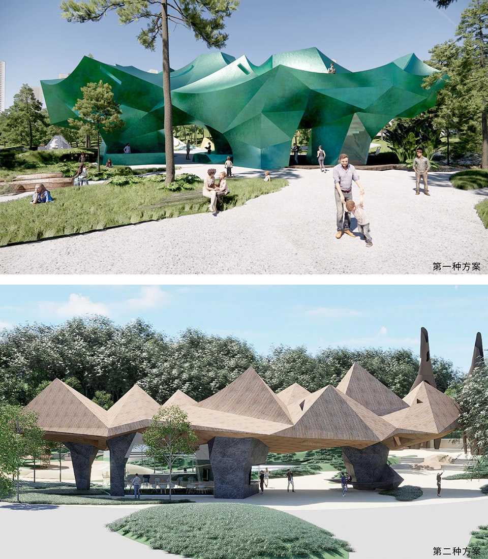 We then integrated considerations of site layout, functional requirements, scale, construction methods, and materials into this design. More importantly, we adjusted the relationship between visual symbols and physical perception, ultimately leading to the realization of the architectural design—even two designs. The first design planned to use oxidized copper panels, while the second used solid wood strips. However, the first design involved extensive double-curved surfaces, which made it very expensive. Therefore, the second design, which used entirely flat surfaces, was ultimately selected.