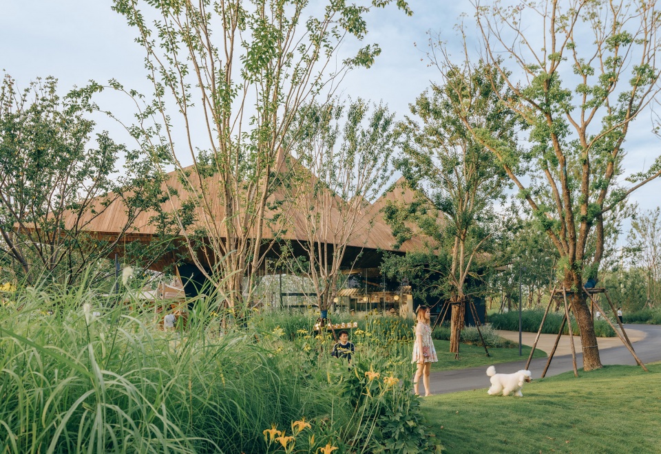 The parents who follow their children enjoy some leisure time, chatting beneath the eaves, which stretch out like a giant tree. With their children running and playing in front of them, the parents occasionally call them over to rest and get a drink. Behind the fully transparent glass, the restaurant and water bar are also bustling with activity.