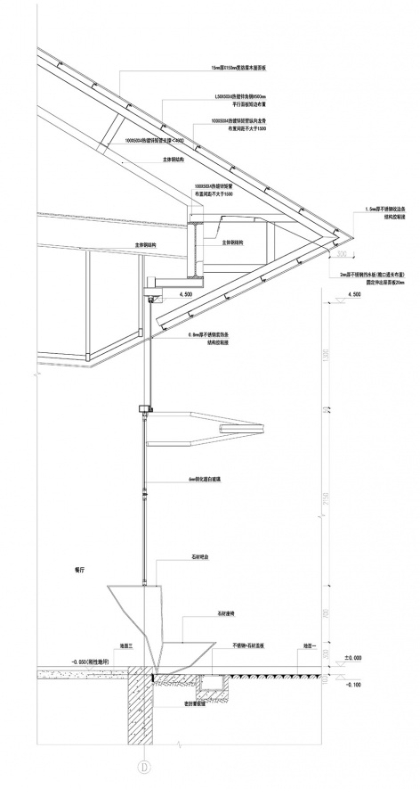 为了使建筑层层叠叠的山形屋顶仿佛从大地里蹦跃而起,主体结构采用了四束组合钢柱来支撑,并且通过外包岩板来分别成为户外座椅,外卖档口,洗手台等功能。上部屋顶为钢网架结构,来实现大的跨度及悬挑,通体外包实木板条,并设置了一些光孔,随之室内的灯具和空调口也在孔内,而厨房和空调等大型设备也皆隐藏于屋顶。