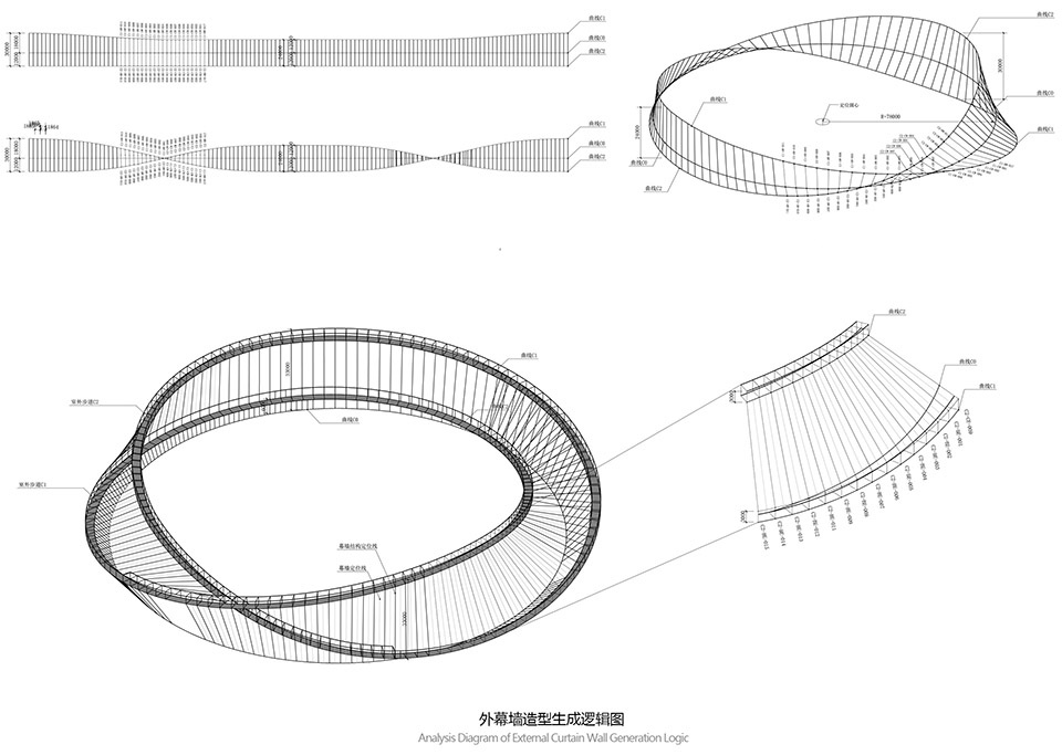深入研究后发现,两次扭转的莫比乌斯环会呈现“一活一静”的双面形态:南侧面向城市广场,布置青少年活动中心等“活跃功能”,让丰富的形态与热闹的氛围呼应;北侧朝向未来住宅区,安排工人文化宫、老年活动中心等“静态功能”,以沉稳的界面契合静谧的生活节奏。建筑地下整体开挖,中部设会议中心与餐厅厨房,既联通南北两区,又满足各功能的共享需求;莫比乌斯环的两条结构环线自然成面,其交线处形成“露天甬道”——既是进入剧场前的仪式性过渡空间,也是划分功能区块的“隐形边界”。至此,莫比乌斯环不再是单纯的装饰表皮,而是深度参与体量塑造的“结构骨架”。外环之内的建筑实体,则采用正交网格系统,让人员流线与功能布局更清晰,也降低了施工难度;沿外侧设置外廊与公共空间,巧妙消解了“圆形外皮”与“方正内核”的衔接矛盾,既留出通透的“呼吸缝隙”,也增强了建筑的开放性。