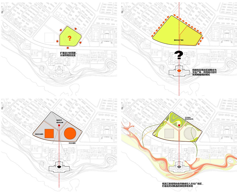 设计团队抓住建筑与自然、人文环境的核心关联:以场地南侧已有的标志性建筑“天汉楼”为空间锚点,顺势拉出一条贯穿南北的城市轴线,将大剧院置于轴线东侧;又因场地坐拥开阔景观,且地处街角节点,遂选定完整的圆形作为建筑形态——如同在新的城市棋盘上落下第一颗棋子,既独立醒目,又与“天汉楼”形成遥相呼应的时空对话。与此同时,设计团队还在轴线西侧规划了另一座文化建筑,轴线北端以标志塔收束,再通过下穿式人行动线,将南侧的文化广场、滨江湿地公园与新建筑群串联起来。这套“以点串线、以线构面”的规划思路,赢得了评审专家的一致认可,也让项目设计权最终落定。