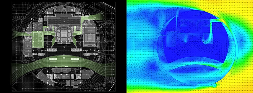 ▼连接室外的“风走廊”及CFD气流模拟,The outdoor “wind corridor” and CFD airflow simulation © BIAD