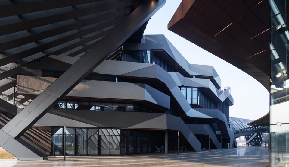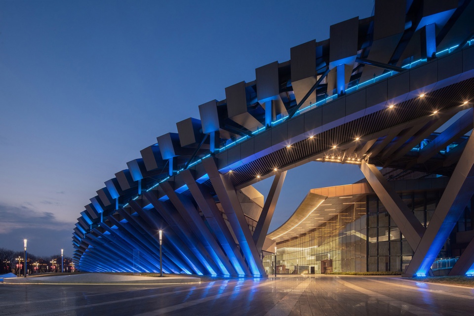 To enhance the vividness of the curved surface dynamics of the Möbius strip, the design team adopted a “cellular grid” design to create a highly rhythmic “strip-shaped” vertical facade. These continuously undulating lines resemble ancient “bamboo slips” unfolding slowly, which not only echo Hanzhong’s historical context but also endow the building facade with greater detailed tension. In terms of technical implementation, the team used Rhino software to conduct rational analysis of the overall shape, prioritizing the uniformity of glass unit dimensions and absorbing shape variables into the solid grid structure. This approach not only reduces the cost of customized processing but also lowers construction difficulty. The solid grid is made of high-pressure thermosetting wood fiberboard. This material not only allows flexible panel division and offers diverse textures but also has low self-weight, enabling easy realization of the large-scale integrity of the external facade.