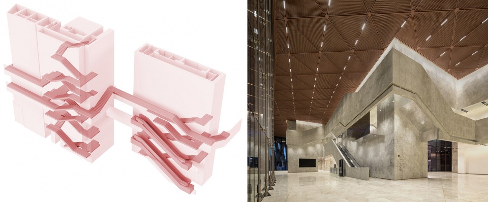 ▼大厅疏散楼梯及扶梯与“栈道”的整合,Integration of lobby evacuation staircases and escalators with the “walkway” © 是然建筑摄影