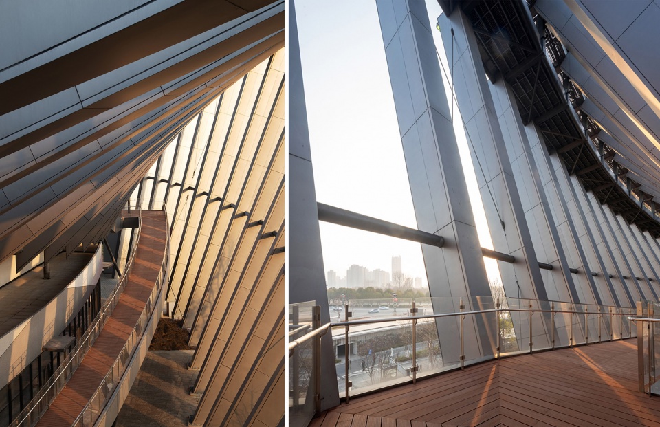 Building on this foundation, the design leverages the structural cavity of a Möbius strip to create two intertwined and undulating “sky plank roads” — with a total length of 1 kilometer — that resemble “parallel spaces” born from the building itself. As visitors stroll along them, they can enjoy views of the Han River and the city from different heights, while the foot traffic on the two loops can also meet and linger in mid-air. These sky plank roads connect various outdoor activity spaces, which not only enriches the pleasure of “walking and exploring” but also creates conditions for commercial operations (such as temporary exhibitions and small-scale performances). The “stretching and undulating” of the building’s external form that people perceive actually stems from the “twists and turns” of internal activities — a concept that echoes the ancient Chinese stratagem: “Openly repair the plank roads, but secretly cross the Chencang path.
