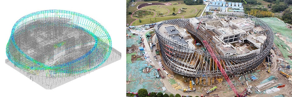结构层面,团队沿莫比乌斯环的每条纵切线设置钢架,每榀钢架在楼层处通过销轴(或链杆)与主体结构拉结,再用两道环形空间桁架将所有钢架串联,协调整体变形——这套空间受力体系,既保证了莫比乌斯环形态的完美呈现,也兼顾了结构安全。
