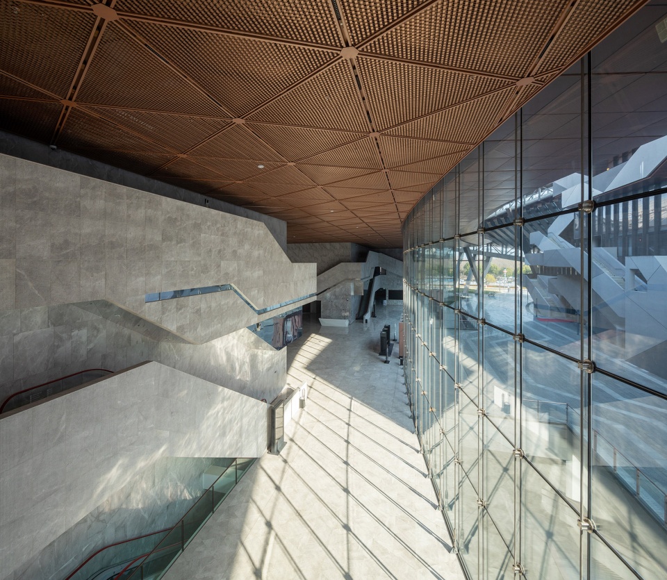 The interior design of the Grand Theater takes “bamboo and stone” as the core materials to create a contrasting atmosphere of “rigid exterior and soft interior”: In the lobby and public spaces, the calmness of stone and the delicacy of the copper-imitated metal ceiling are used to shape a grand and solemn “public interface”; In the grand theater auditorium and multi-functional small theater, a large amount of heavy bamboo is adopted as the main decorative material. The warm texture of bamboo not only neutralizes the cold hardness of stone but also implicitly echoes Hanzhong’s regional characteristic of “abundant bamboo resources”.