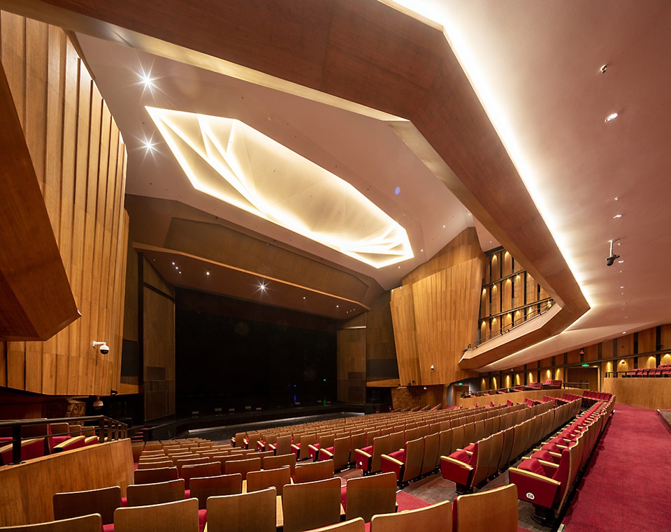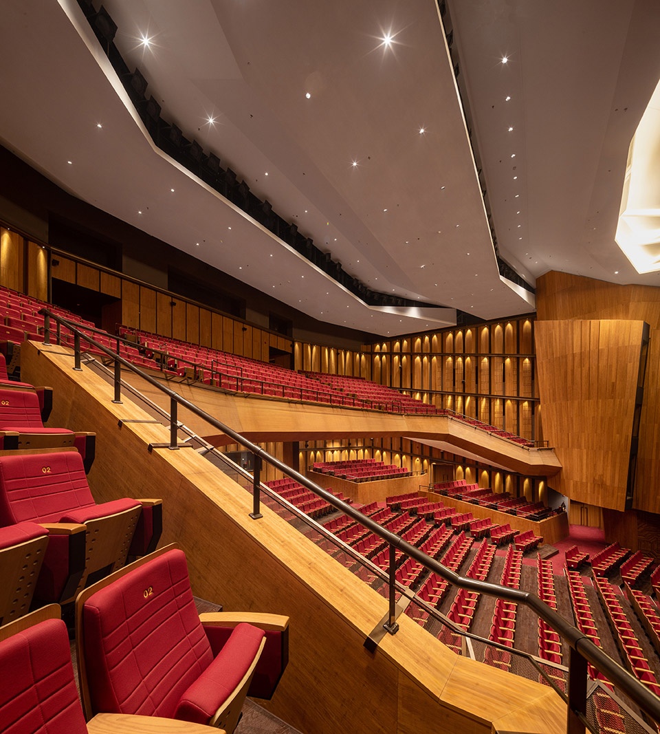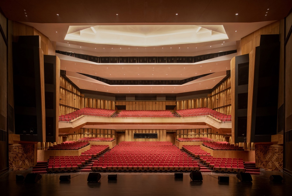 The space of the grand theater auditorium is designed with a folded surface to form a “crystal-like” cut structure, which not only enhances the spatial three-dimensional sense but also facilitates acoustic diffusion. Due to the large width of the stalls, an island-type unit layout is adopted on both sides, which not only improves the acoustic effect but also enriches the visual experience of the audience seats. The design team adjusted the volume of the auditorium, the angle of the folded panels, and the material application repeatedly in combination with acoustic simulations to ensure the optimal sound effect. The ceiling is decorated with an abstract “Han Dynasty lotus” pattern, implicitly echoing Hanzhong’s cultural symbols. In addition, a cavity is reserved between the grid structure on the side walls of the auditorium facade and the civil engineering wall, which also provides a channel for natural ventilation.