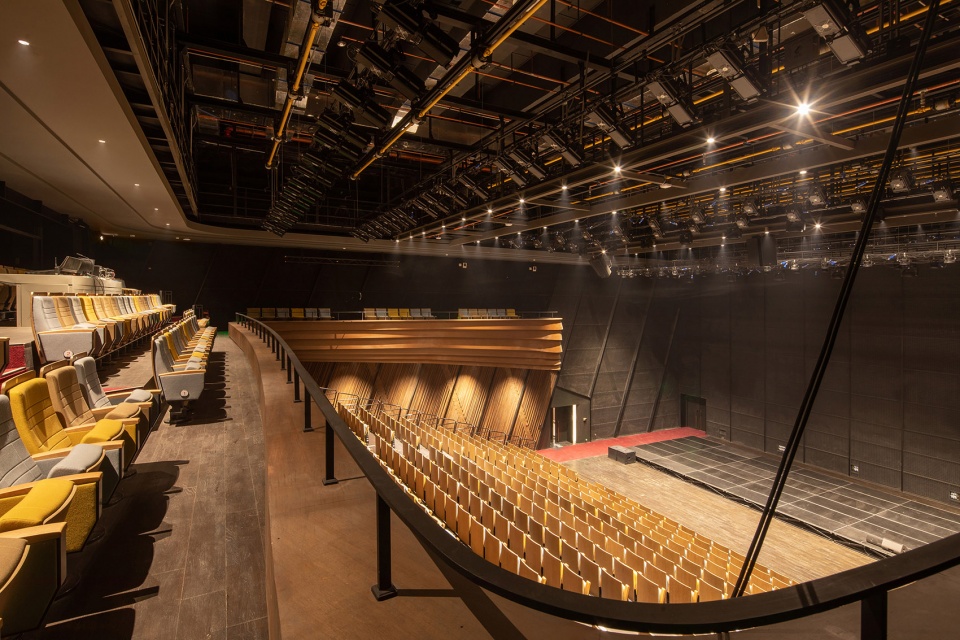 大剧场观众厅的空间以折面形态打造“晶体状”切面结构,既增强了空间的立体感,也利于声学扩散;因池座面宽较大,两侧采用岛式单元布局,既提升了声学效果,也让观众席的视觉体验更丰富。团队结合声学模拟,反复调整观众厅的容积、折板角度与材料做法,确保音效达到最优;顶部则以抽象的“汉莲”造型为装饰,含蓄呼应汉中的文化符号。此外,观众厅立面侧墙的格构与土建墙体之间预留空腔,也为自然通风提供了通道。