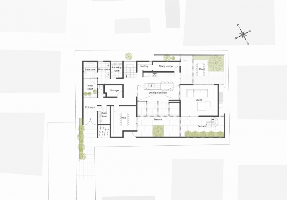 基于这些原因,我们决定采用类似里亚德(riad)的方式,将各个房间围绕庭院布置。与其说是单一庭院式的环绕布局,不如说是在场地中分散设置多个庭院,使每个房间都能接触到户外空间。庭院也以与建筑相当的墙体围合,通过遮挡来自周边的视线,确保户外与室内都拥有同等高品质的私密性。这样一来,无论身处住宅的哪个位置,都能感受到阳光与舒适的微风,实现惬意的居住体验。庭院中的植栽增强了与自然的连接,最大限度地带来清新与放松的效果。尤其是象征性的橄榄树,为住宅增添力量与安心感,成为家的精神支柱。