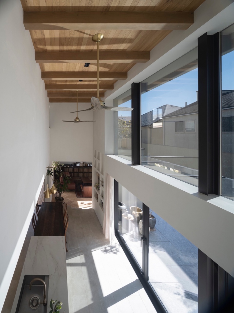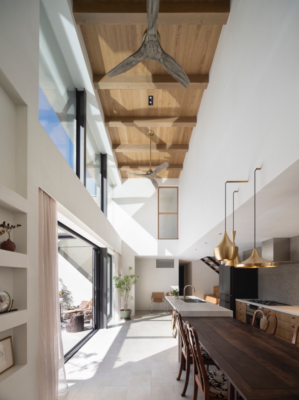 Upper-level view of the double-height kitchen and dining area © Hiroshi Ueda
