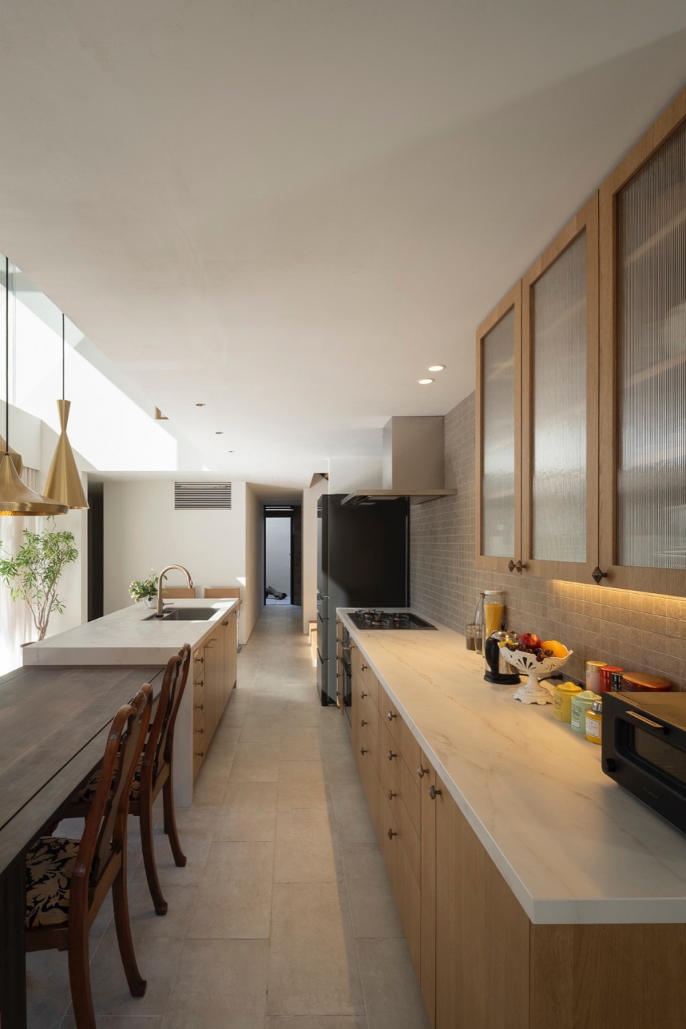 The first floor is a public space centered around the kitchen, and the second floor is a private room, making it easy to understand, but all the rooms are connected to the gardens and terraces scattered throughout, allowing you to move around inside and outside in a three-dimensional way as well as on a flat surface. After passing through a maze-like traffic flow and an alley-like corridor, you will find a square-like garden, and I think we have created a fun space like a “riad”.