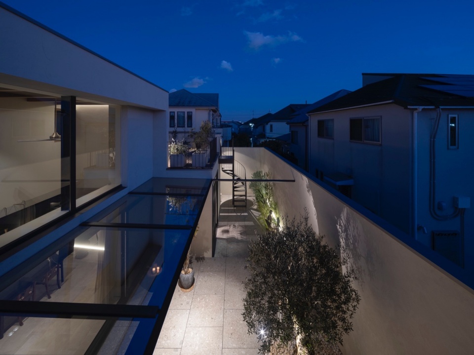 ▼屋顶与庭院夜景,Nighttime rooftop and courtyard view © Hiroshi Ueda