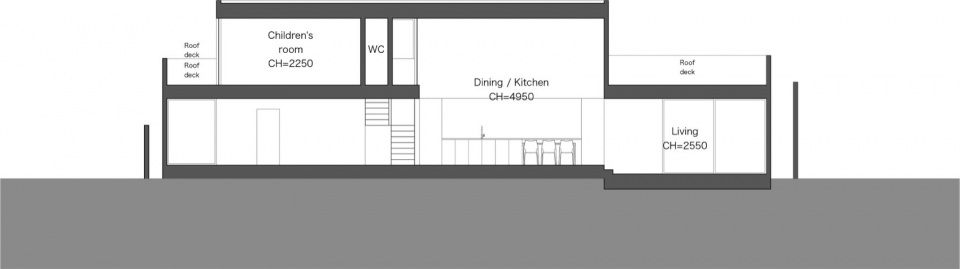 一层作为以厨房为核心的公共空间,二层为私密房间,空间分布清晰明了。但所有房间都与散布其间的庭院和露台相连,使人不仅能在平面上自由穿行,也能在立体动线上穿梭于室内外。穿过如迷宫般的动线与小巷般的走廊后,会突然进入类似广场的庭院,我认为我们营造出了一个充满趣味、令人联想到“里亚德”的空间。