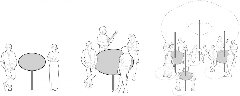 The tabletops, with diameters of 800mm and 1200mm, recreate the “reunion” atmosphere of traditional Chinese round tables—this is also the most suitable social distance for neighborhood interaction. The mirrored stainless steel material reflects the overhead installation on the ground, creating a visually interesting blend of virtual and real.