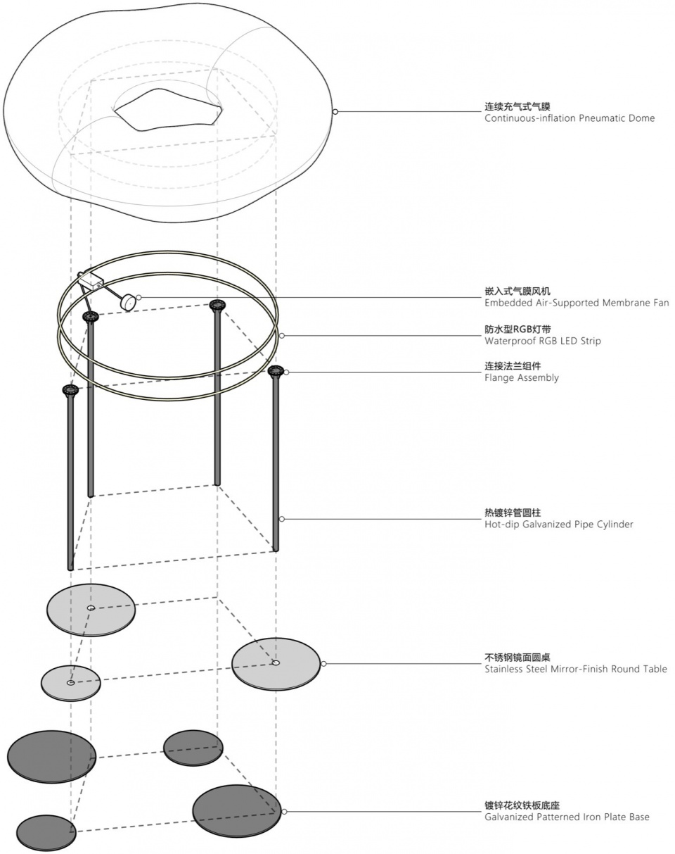 「一圈京味」则从北京传统小吃“焦圈儿”中汲取灵感,取其圆融之态,寓意汇聚与分享。设计将这一饮食符号转化为悬浮于街巷上空的环形装置,构建从私密到开放的多层次社交空间。装置系统主体由连续充气式气膜通过法兰组件连接热镀锌管圆柱构成,不锈钢镜面圆桌悬挂在1100mm高度,圆柱底座选用圆形镀锌花纹铁板。这种集成化设计满足临时性公共设施的快速搭建与回收需求。