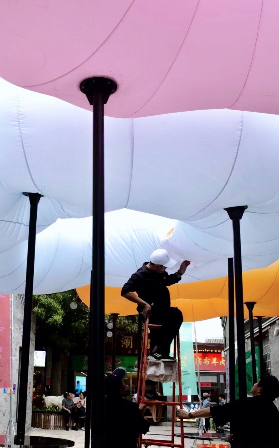 By day, the air membranes stretch like clouds, offering shade and shelter; by night, colorful lights flow, mimicking the oily sheen of Jiaoquan floating in the darkness, creating a poetic realm where taste and light intertwine.