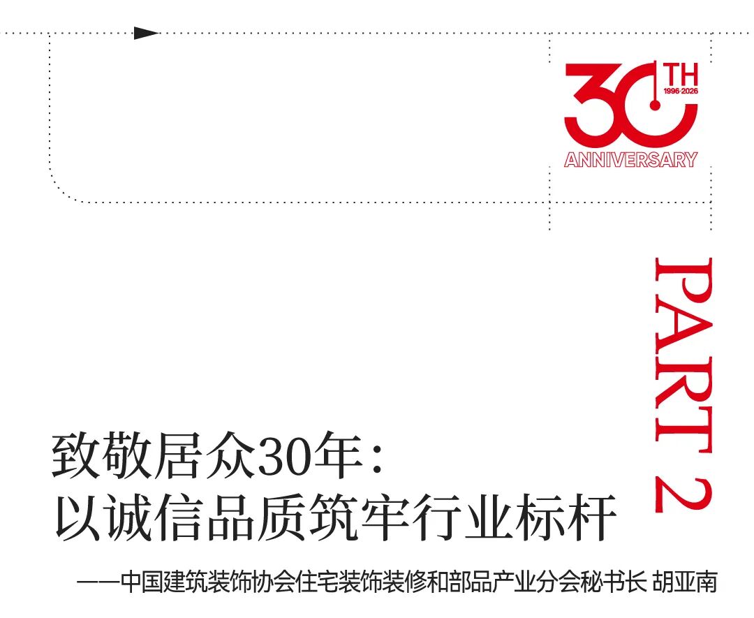作为特邀嘉宾之一、中国建筑装饰协会胡亚南秘书长在致辞中指出:“回顾居众30年发展,其步伐始终与行业迭代同频,是推动家装标准化、正规化发展的行业标杆,也是守正创新的实践典范。”