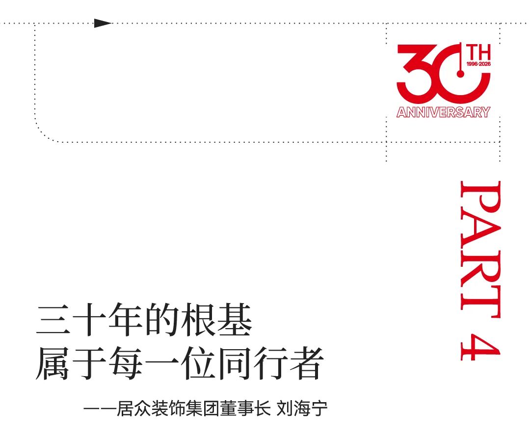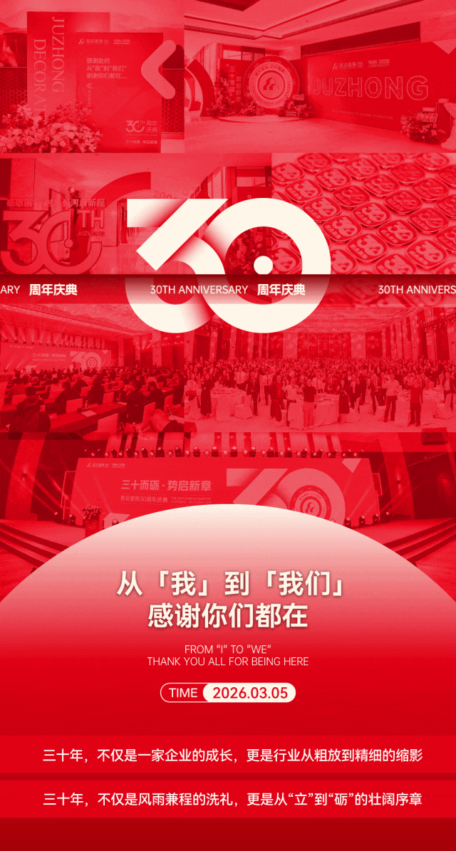 “三十载基业,非一人之功。感谢所有居众人:是工程部工友的双手,筑起品质基石;是设计团队的匠心,点亮家的想象;是管理团队的统筹,护航稳健前行;更是每位一线伙伴的汗水,共同写就这30年篇章。同时感谢一路相伴的合作伙伴、媒体朋友与给予信任的万千客户,是你们共同构成了这片生长的土壤。