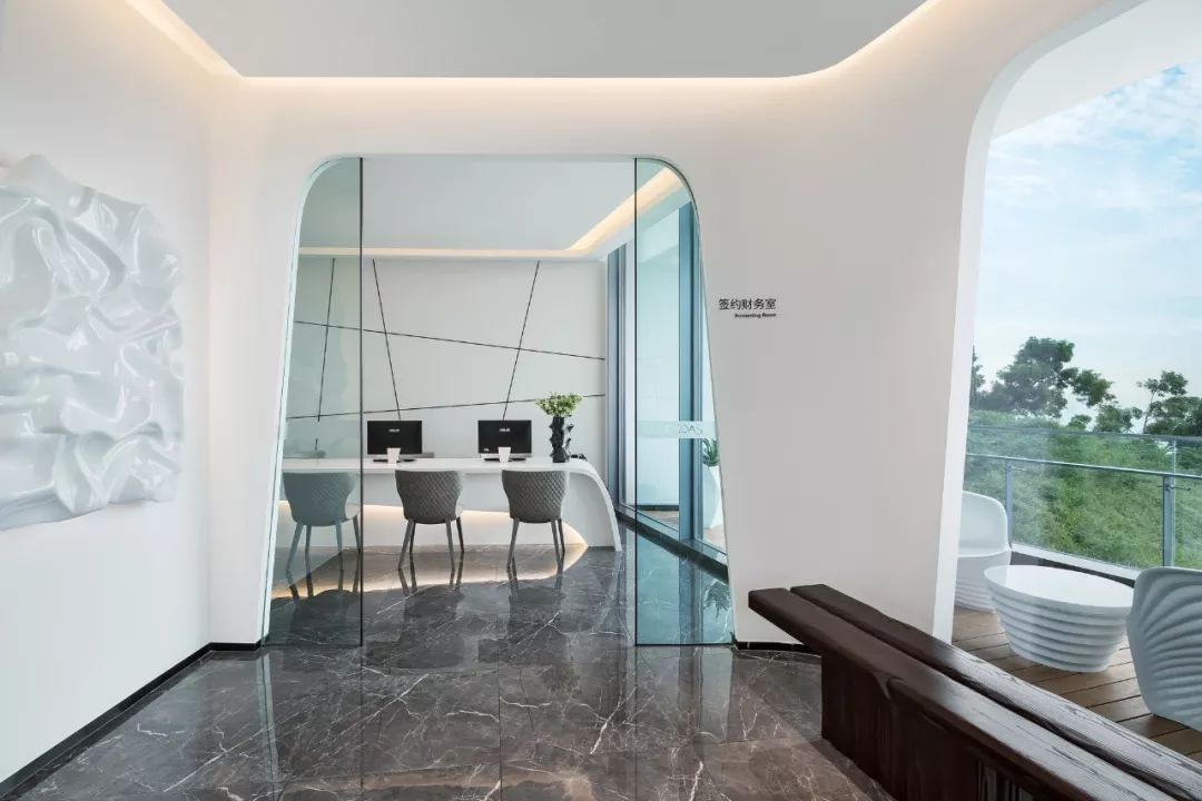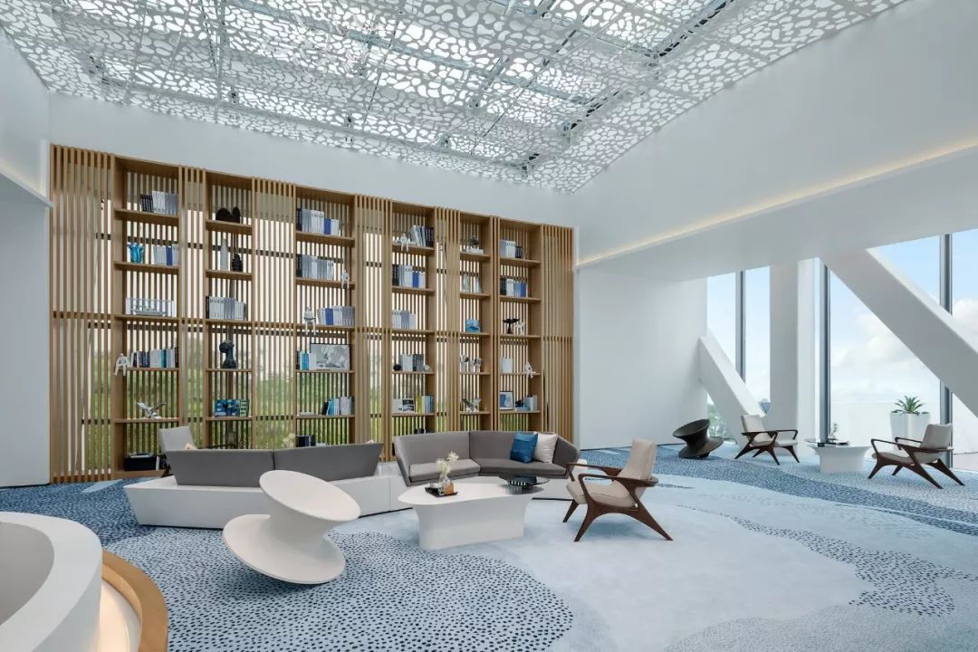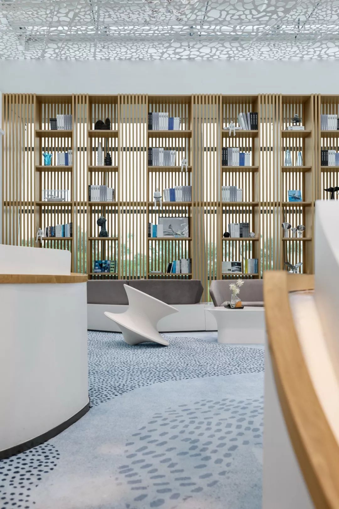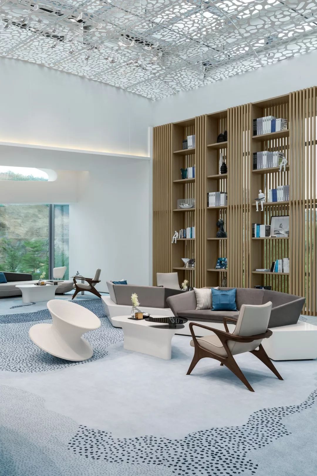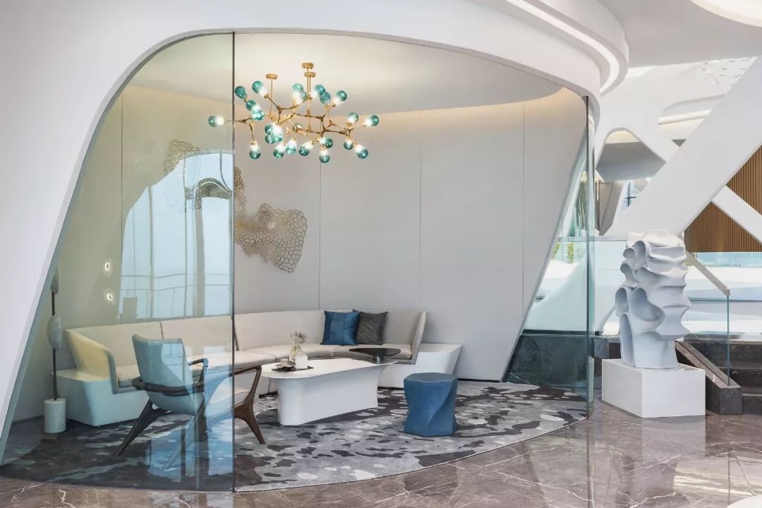 建筑立面大片的落地玻璃,让山光水色尽收眼底,从此后,“面朝大海,春暖花开”的理想生活,不再可望不可即。呼应硬装设计理念,在软装设计上,大都荟以丰富的艺术想象升华自然之美。家具、艺术品极具现代感的曲线与造型,抽象演绎山林海洋的自然景物,营造出“馆在山海中,馆内藏山海”的意境。