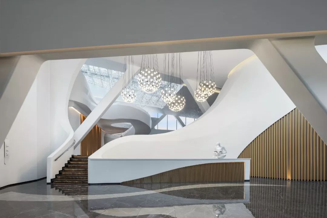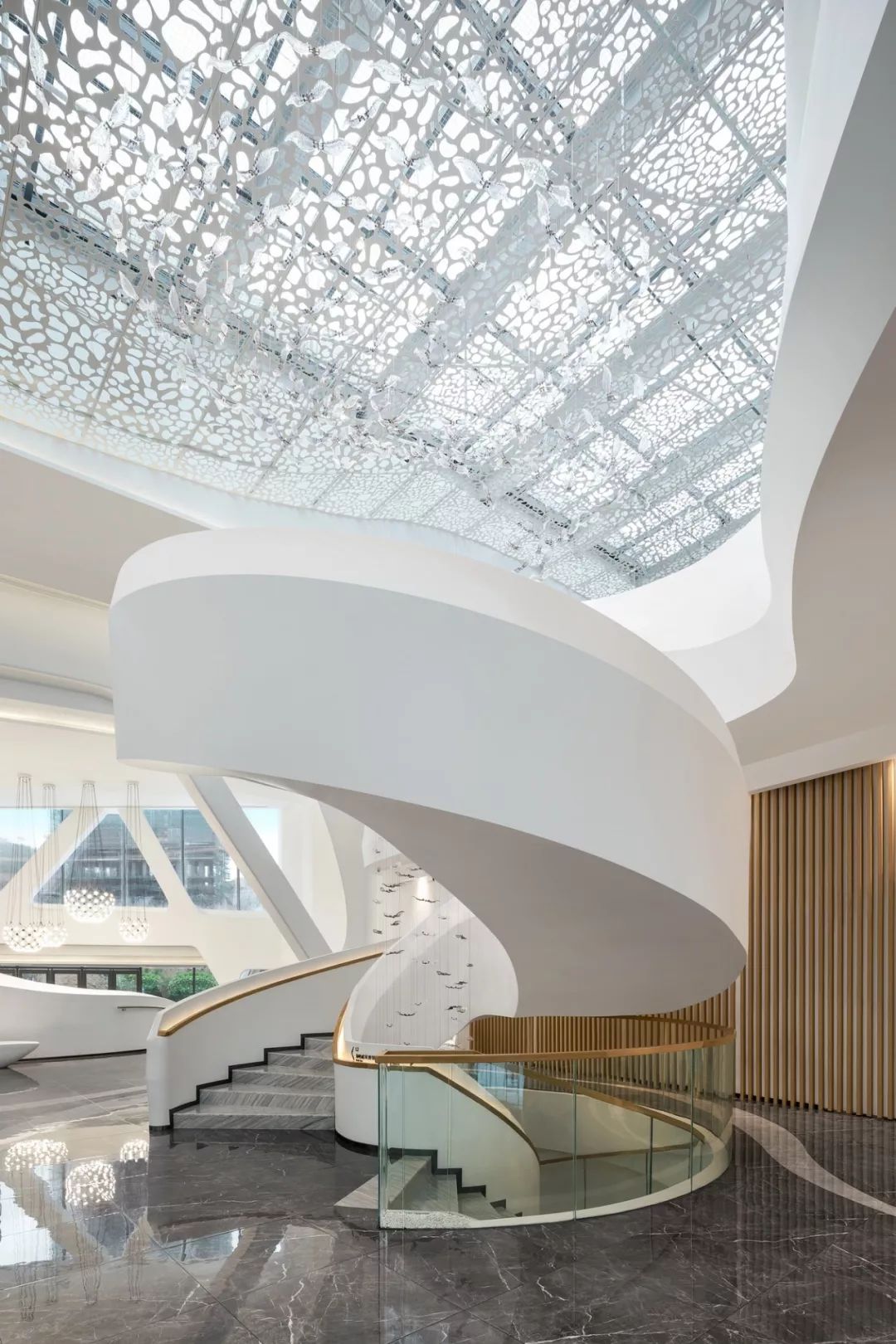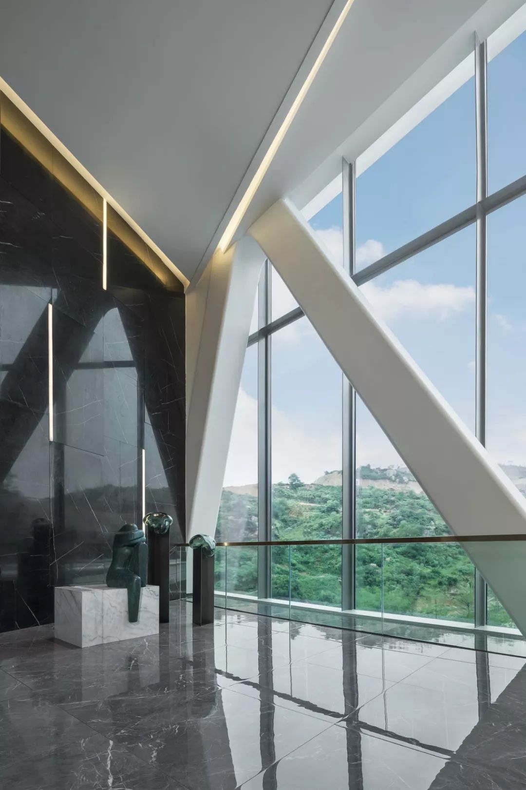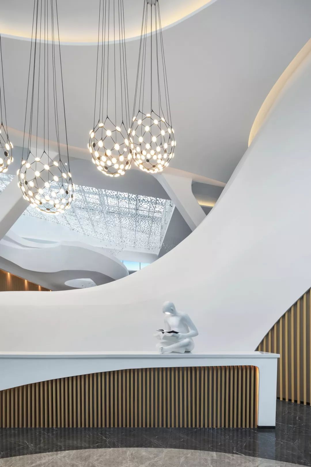 建筑立面大片的落地玻璃,让山光水色尽收眼底,从此后,“面朝大海,春暖花开”的理想生活,不再可望不可即。呼应硬装设计理念,在软装设计上,大都荟以丰富的艺术想象升华自然之美。家具、艺术品极具现代感的曲线与造型,抽象演绎山林海洋的自然景物,营造出“馆在山海中,馆内藏山海”的意境。