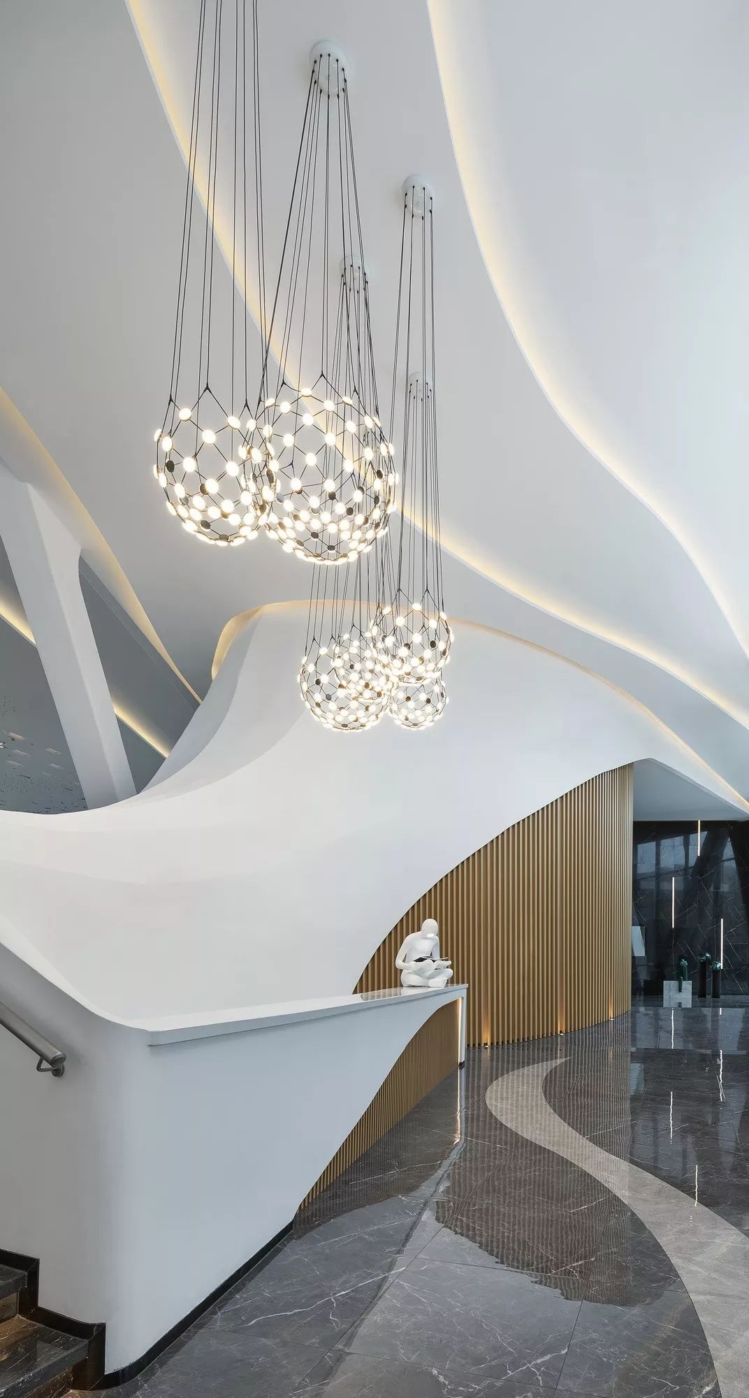 接待总台吊灯,是一件充满记忆的艺术品。吊灯取形于渔网,以近乎透明的网状结构,隐藏器具的物质形式,为空间真正的主角——“光”让位。这“光”是触碰记忆的开关,将遥远时光里对临海而居的美好想象,与眼前时尚高雅的艺术生活一一融汇交织。