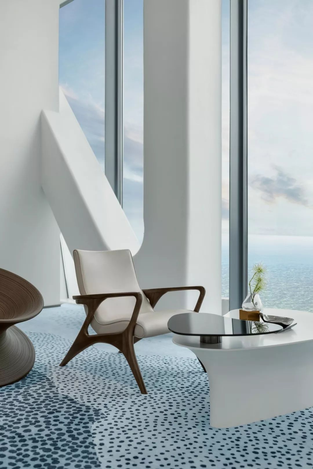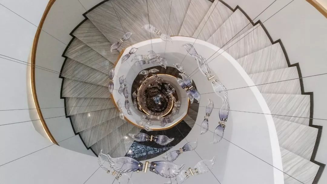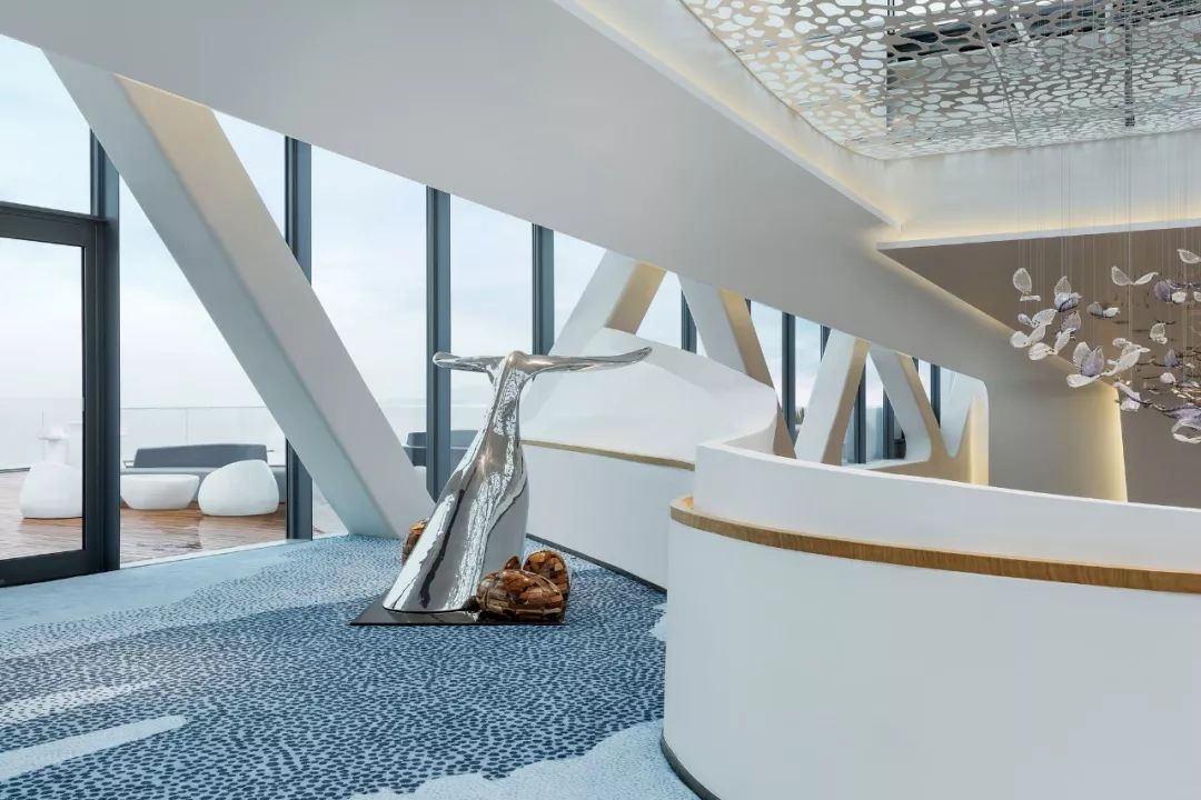 Thomas Heatherwick名作陀螺椅的点缀,不仅提升空间艺术格调,更增添趣味性与设计感。一组充满力量感的“鱼尾”艺术装置,呼应天花盘旋的海鸥吊灯,构造出“人在海上”的空间错觉。