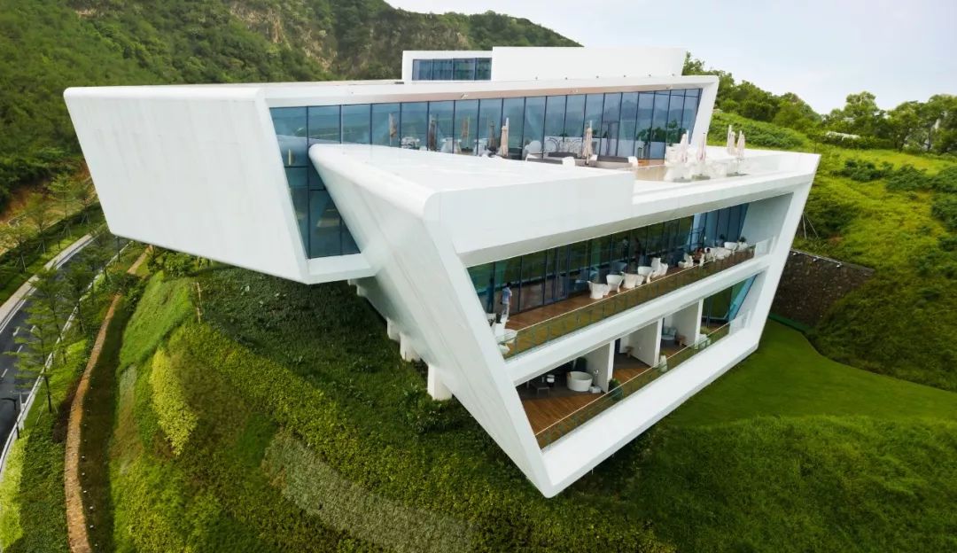 海与天相接,山与海呼应,在这绝美的山海之间,一座纯白艺术馆傲然挺立于悬崖之上,宛如展翅纸鹤,等待乘风而起,飞往无限辽阔的世界。