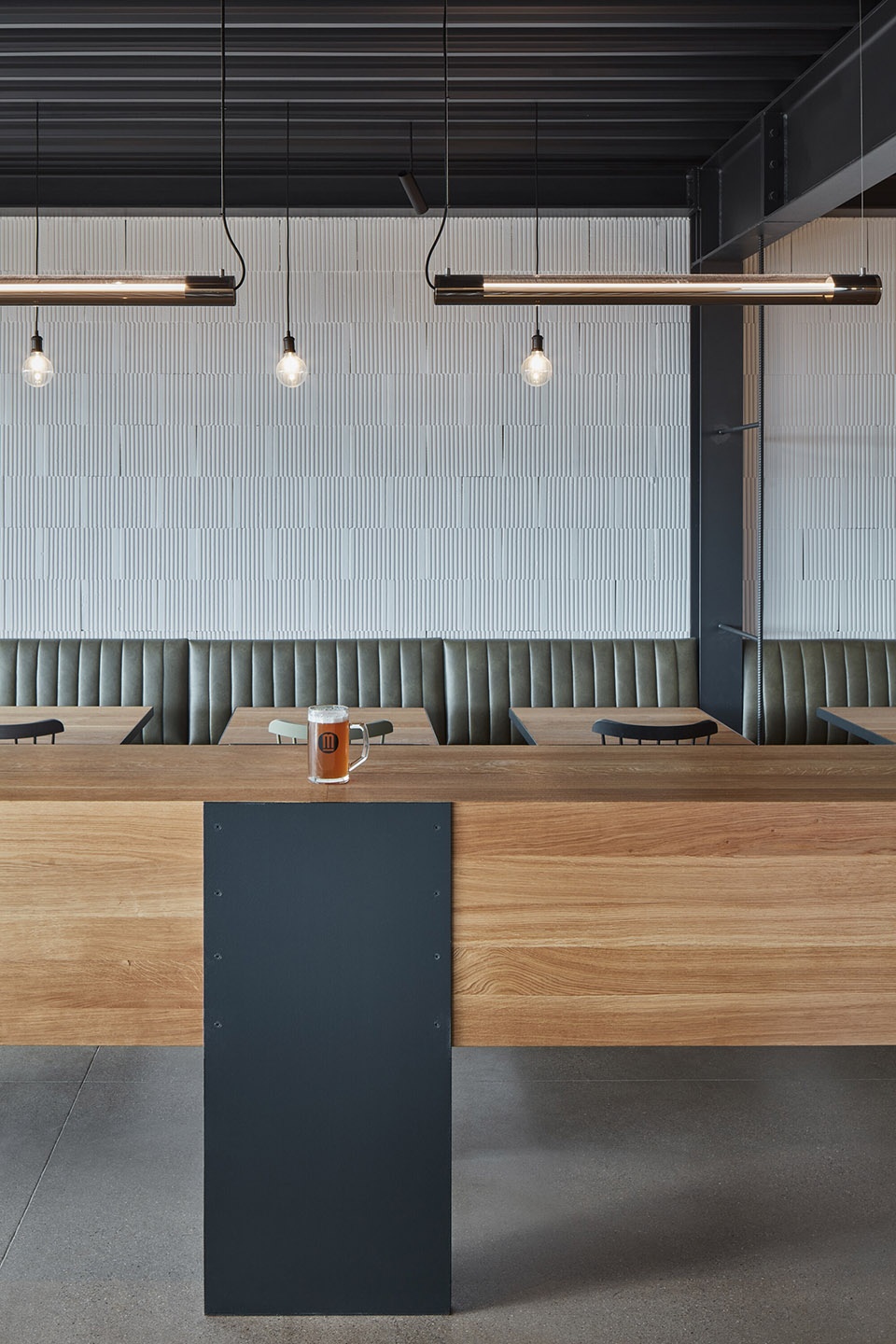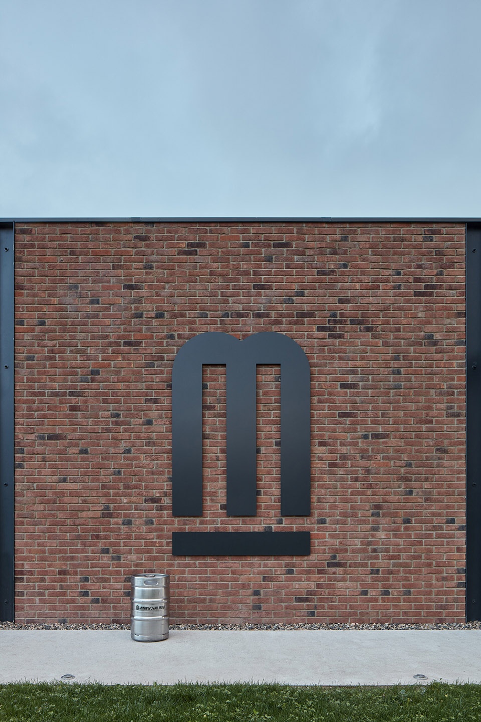 Dominating the façade is the graphic, black steel plate logo featuring the letter “M”. As the focal point of the façade, the logo articulates the overall straightforward image of the building and communicates with its surroundings. It also relates to the beer brewed inside. Adjacent to the restaurant is a terrace partly covered by a wired construction. In the summer months, the construction will have hops climbing up it, just like in the nearby hop gardens.