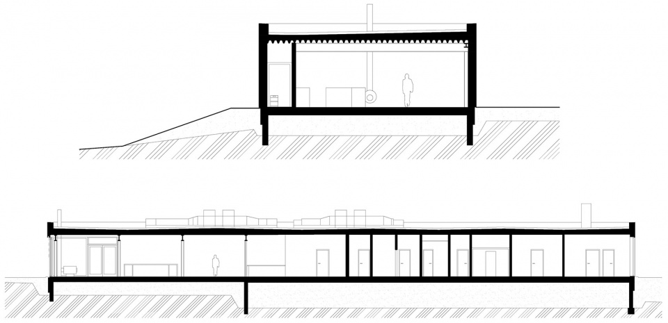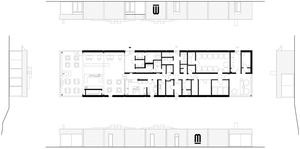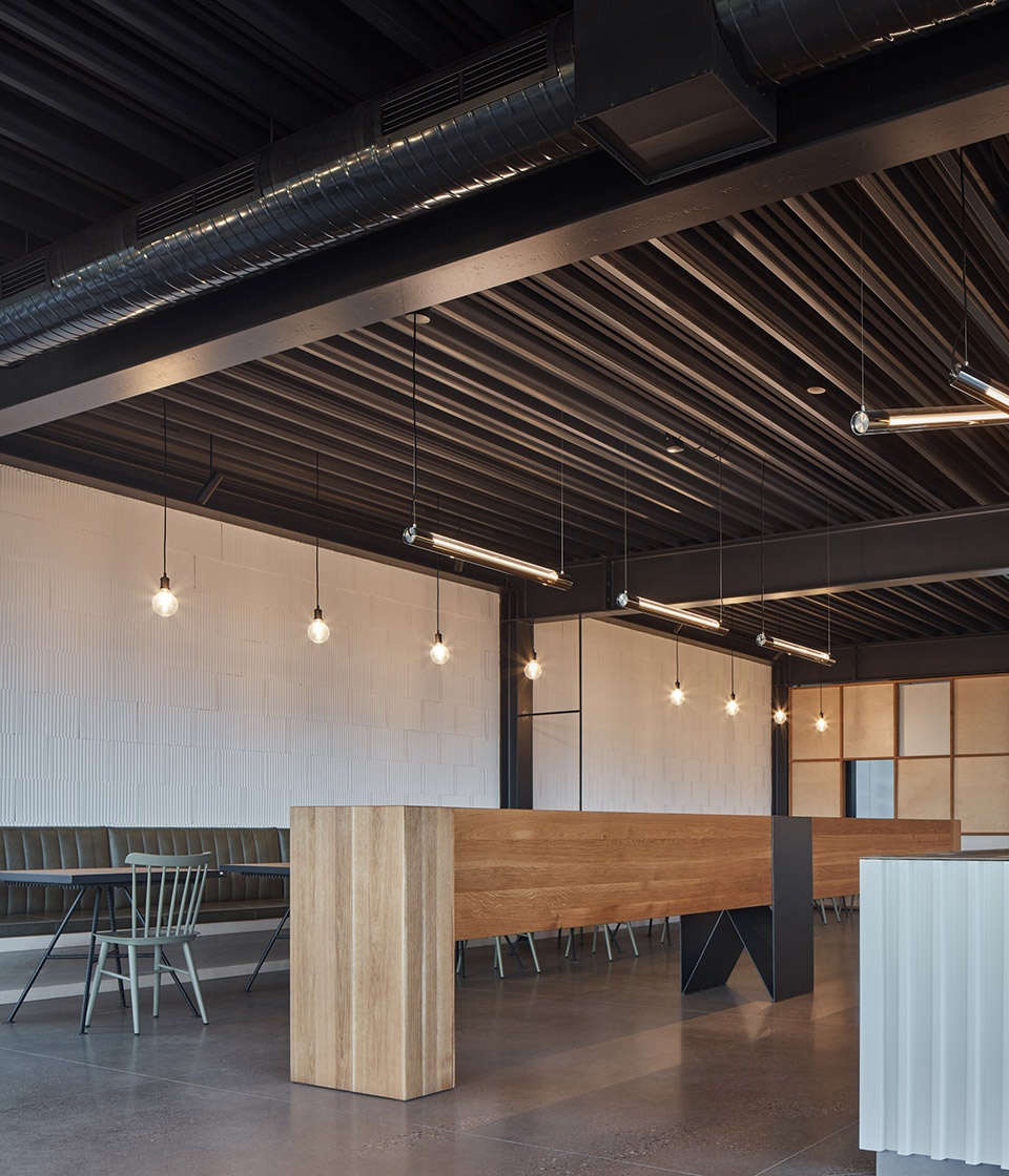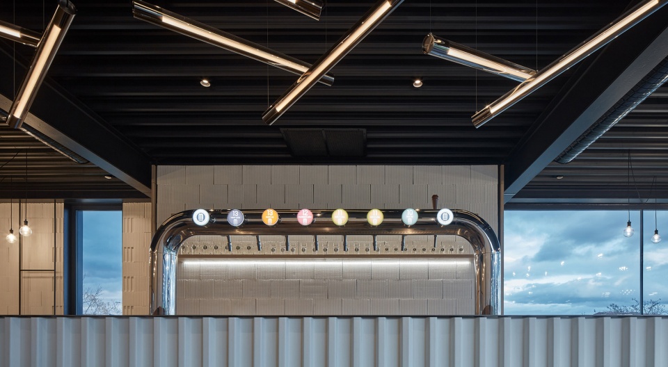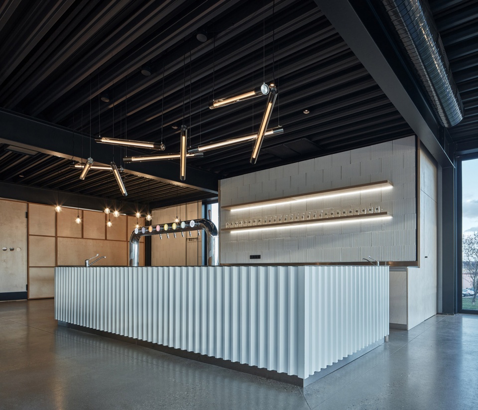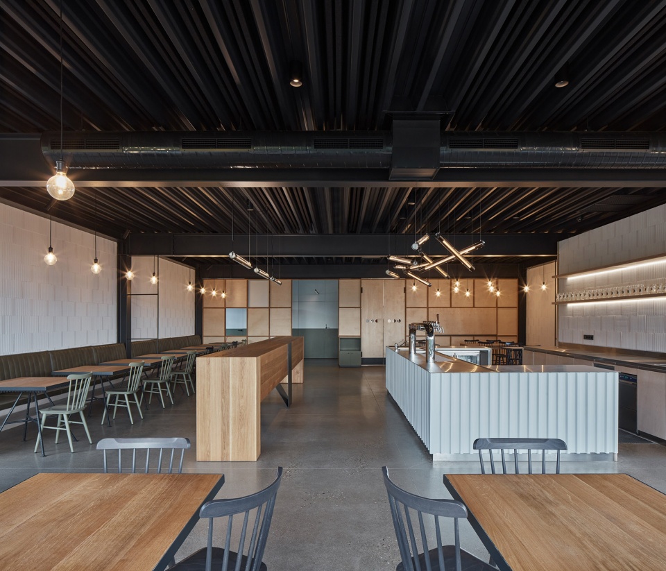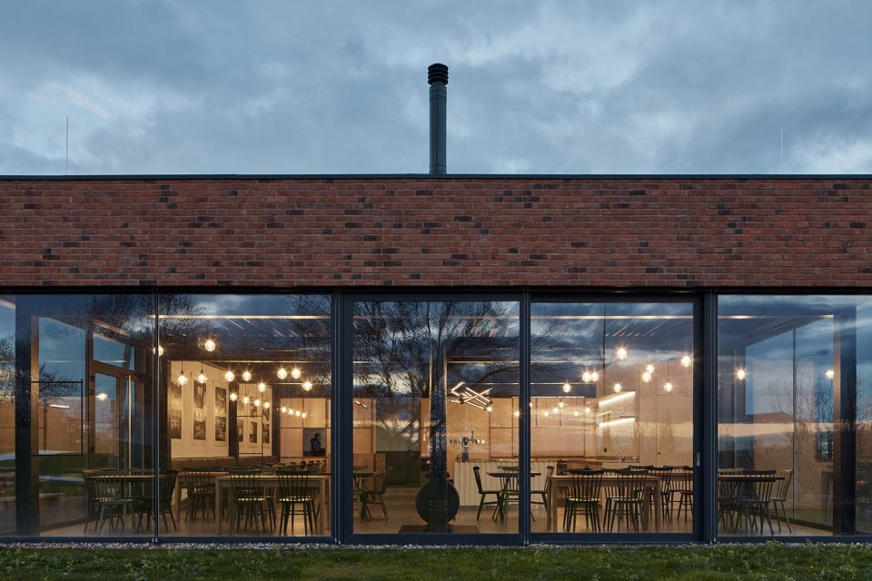 根据项目的功能需求,长条形建筑中包含两个主要的操作单元。北侧为生产啤酒的啤酒厂,南侧为餐厅,包含一间酒吧和厨房。