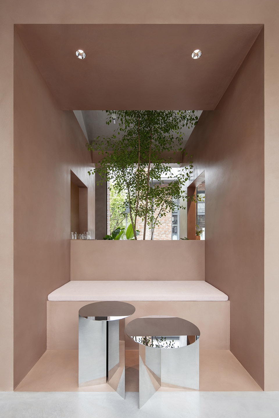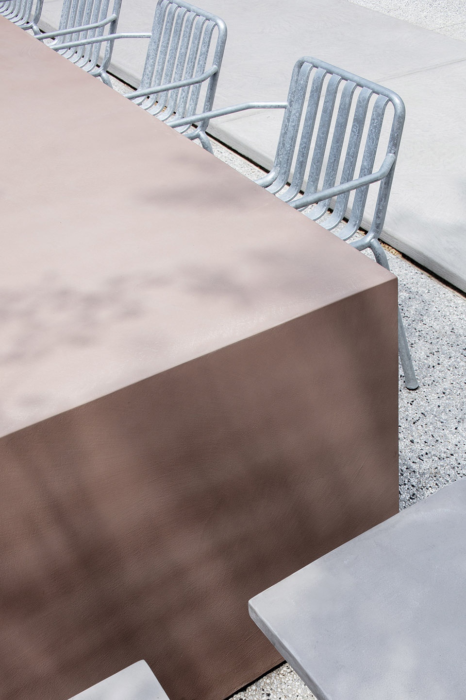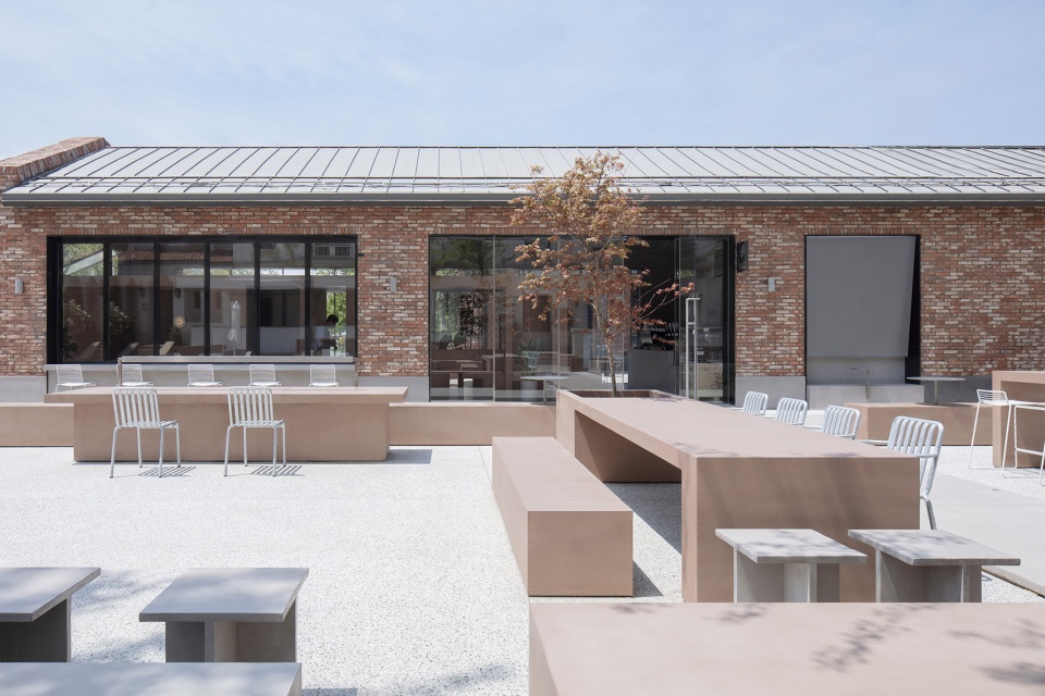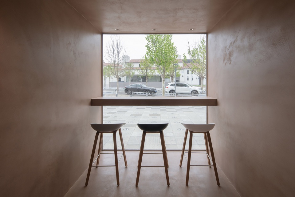 ▼外摆区家具选用与室内相同的茶色水泥,the fixed furniture of the exterior is made of the same pigmented Dagu cement with the interior cafe box © 夏至