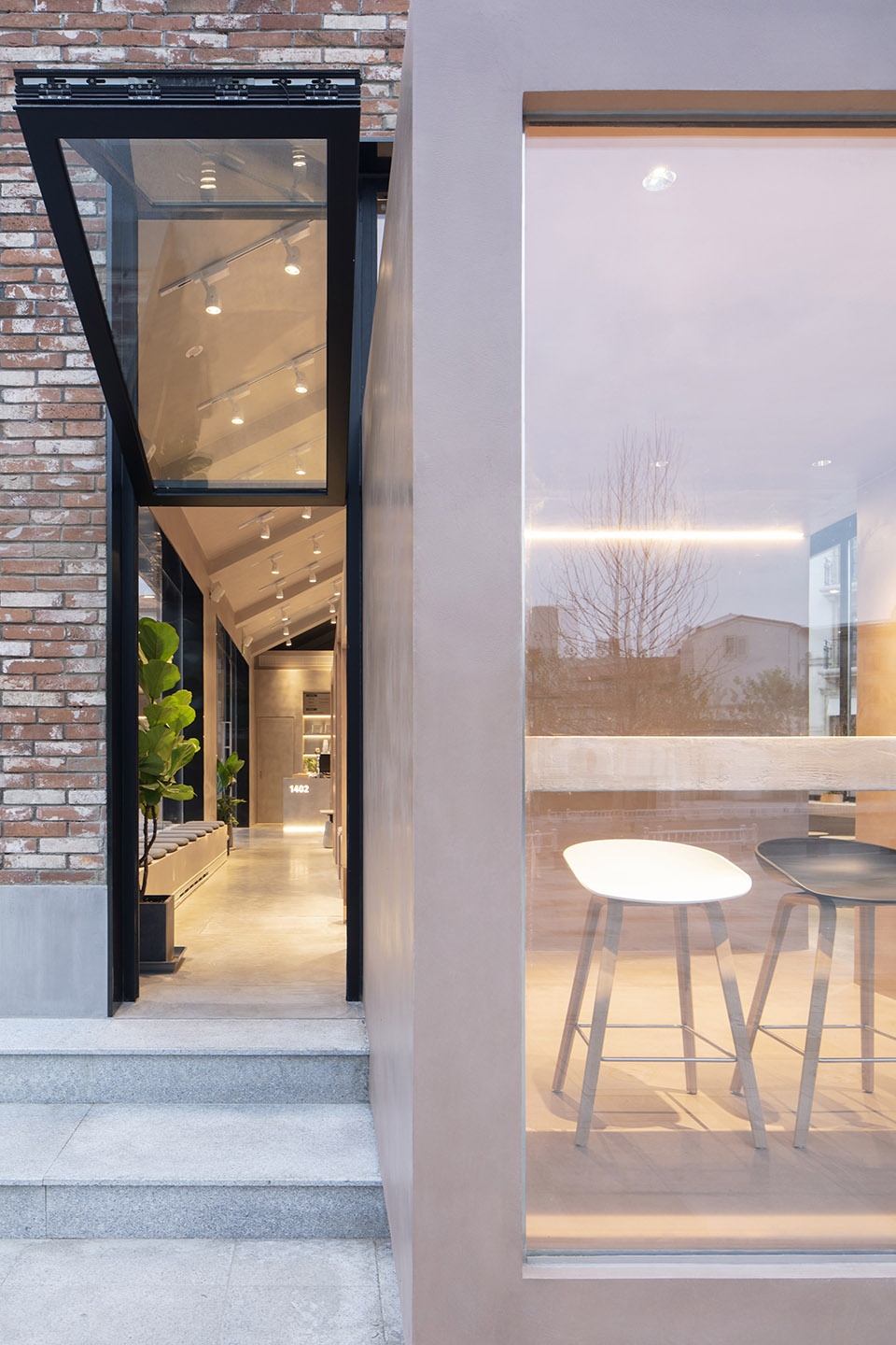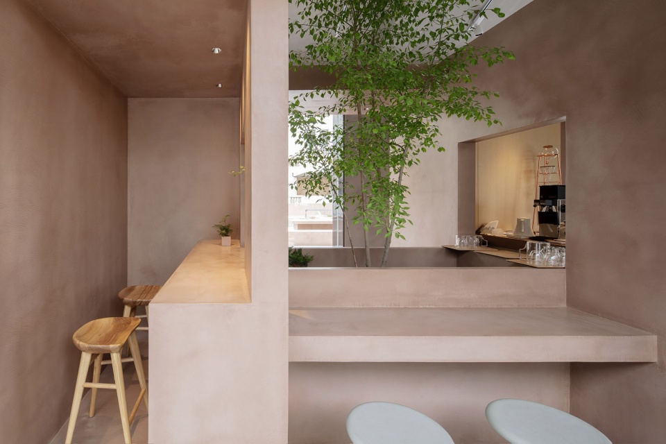 Within the interior space, we insert a new volume into the existing building. The rectangular box forms a new cafe experience that integrates the functional needs of seating, waiting area, pour over bar, display and landscape, while dividing the open space to offer guests a variety of spatial experience. The pigmented Dagu cement box extends to the street-facing facade of the red brick building, which defines a new visual focus for the originally dull facade, arousing the curiosity of guests to explore in the space.