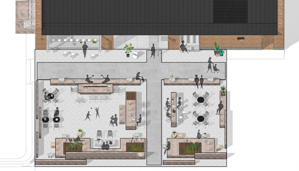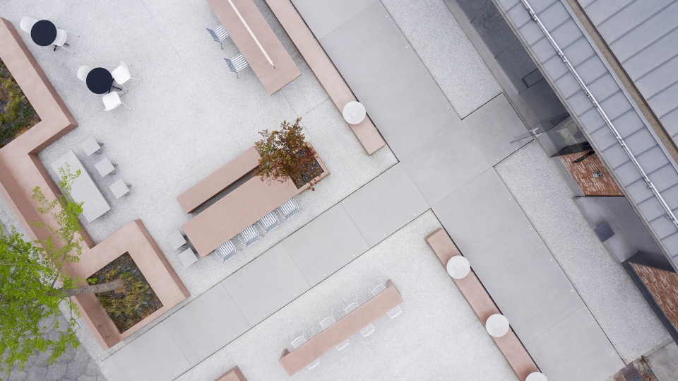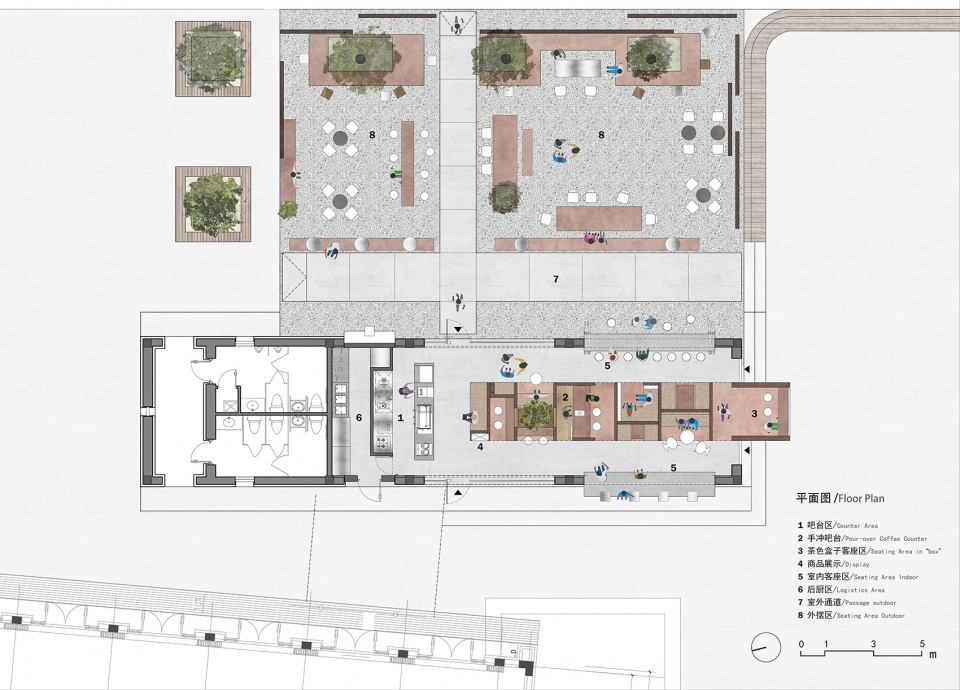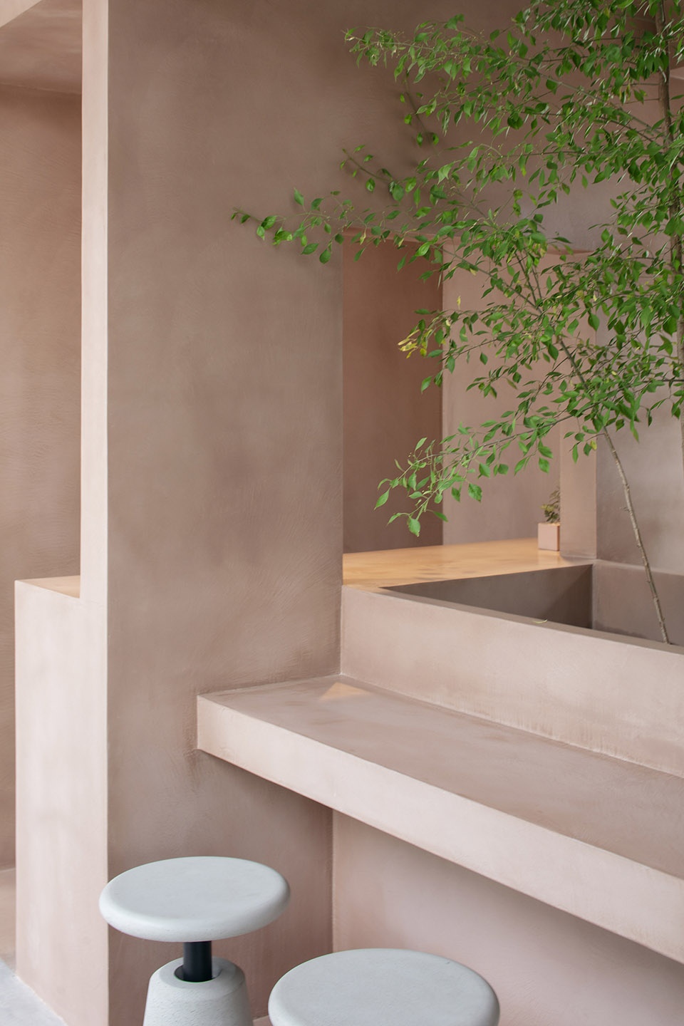 The cross-shaped outdoor platform helps maintain a visual continuity between indoor and outdoor, meanwhile dividing the outdoor seating into four areas. The fixed furniture of the exterior is made of the same pigmented Dagu cement with the interior cafe box, which strengthens the integrity and continuity of the interior and exterior. We strategically arrange outdoor partition walls with different heights, seating, tables and bar tables to create a sense of spatial enclosure and dynamic layering of space. In addition, the light grey exposed aggregate concrete for the exterior floors presents a soft and natural atmosphere of outdoor courtyard.