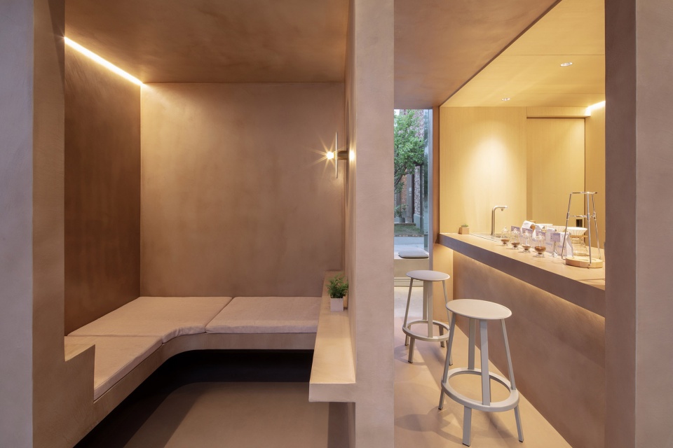 不同于一般咖啡店意式吧台和手冲吧台一体的形式,在1402咖啡店中茶色水泥“盒子”的中心,还隐藏这一个独立的手冲吧台。想要安静地体验手冲咖啡的客人,可以到这个盒子中的手冲吧台享受咖啡,抑或是和咖啡师单独交流,不会受到外界的打扰。