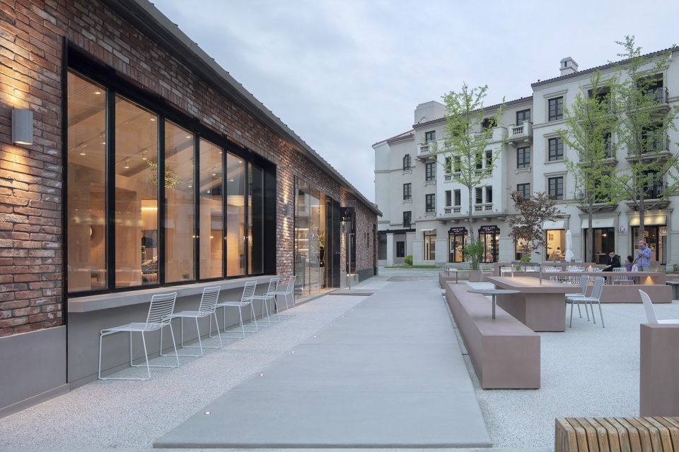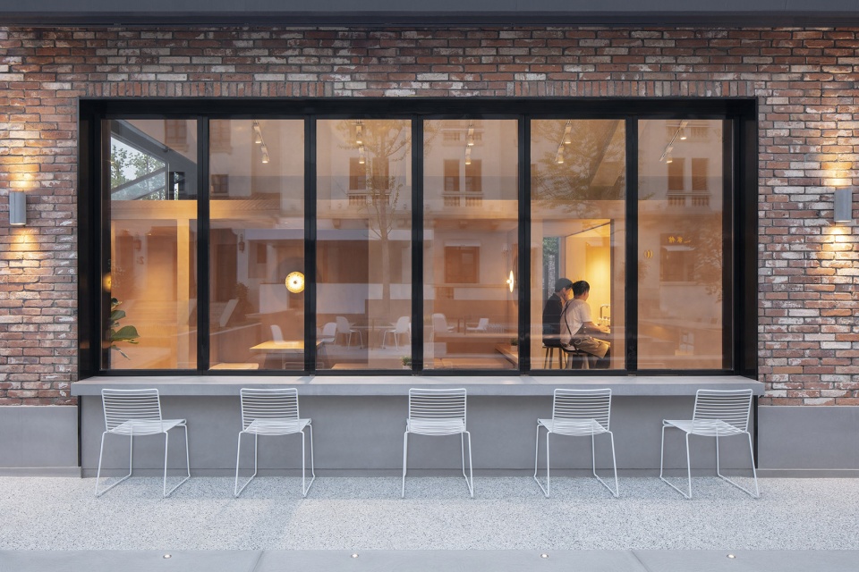 The new glass facade features fully-operable folding doors and windows facing both the square and the outdoor cafe area, and increases interaction between the interior and the exterior. The core zone of the box is divided into semi-private seating and spaces with different scales. The spatial strategy promises comfortable sense of scale for guests from those who want to be alone to a couple of close friends.