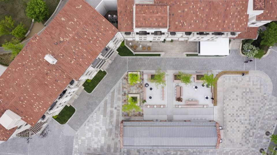 外摆区部分,以十字形的大古席地材质通道平台连通了各个方位,同时将外摆区划分为两大两小四个区域。外摆区的固定家具材质都选择了和室内中心盒子一样的茶色水泥,加强了室内外的整体性和关联性。利用室外固定家具中高低不一的矮墙,坐台,桌子,吧桌增加了外摆区的围合感和空间的层次。地面的水洗石材质也增添了庭院的感觉。