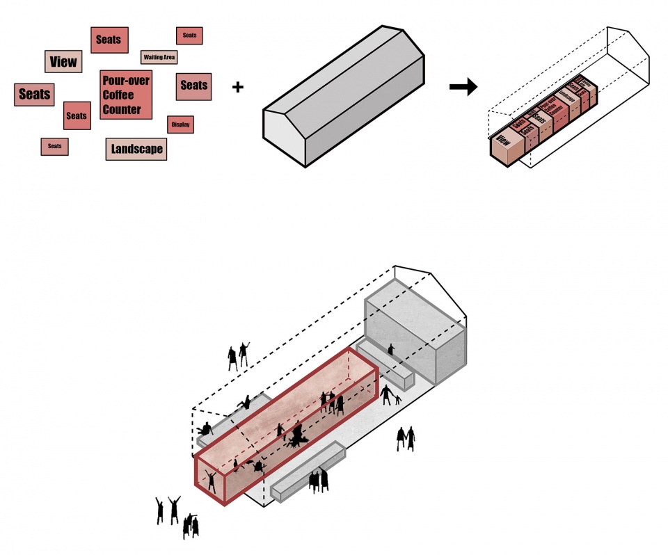 ▼一个新的咖啡体验“盒子”插入到原有建筑之中,a new volume has been inserted into the existing building © 夏至