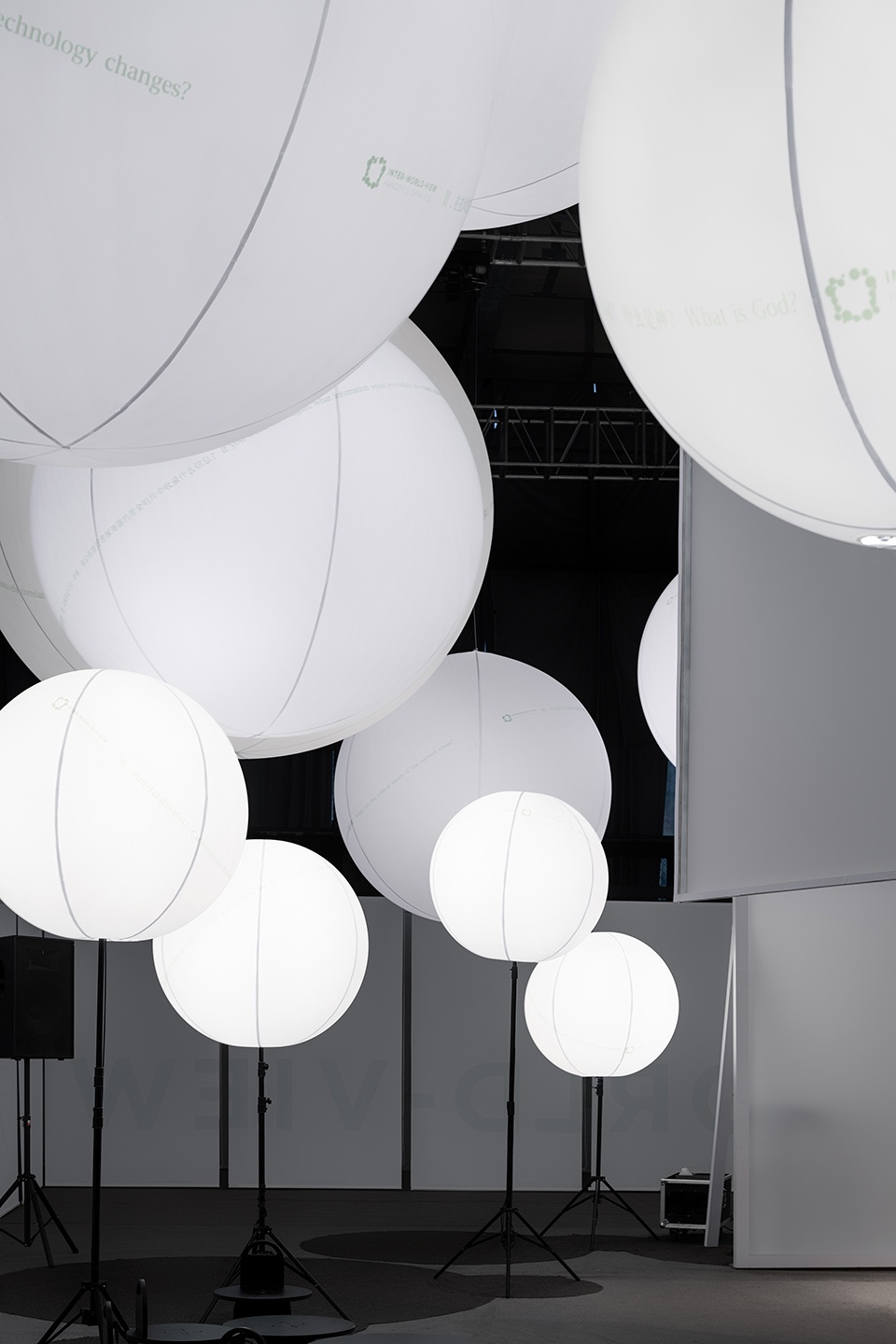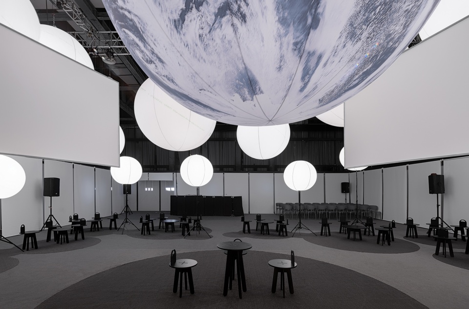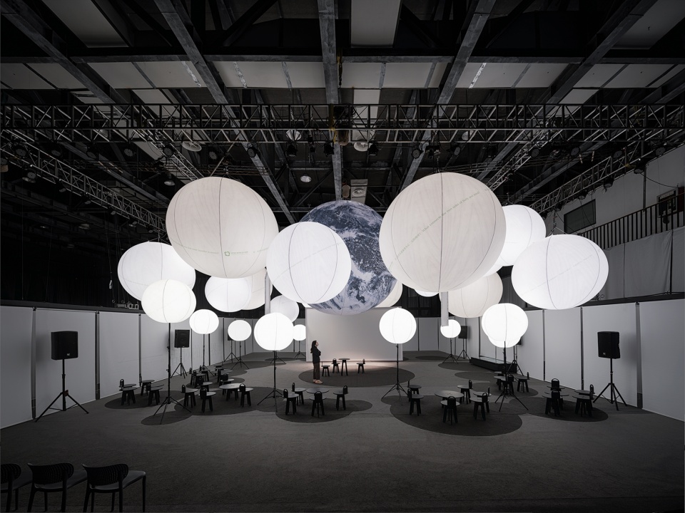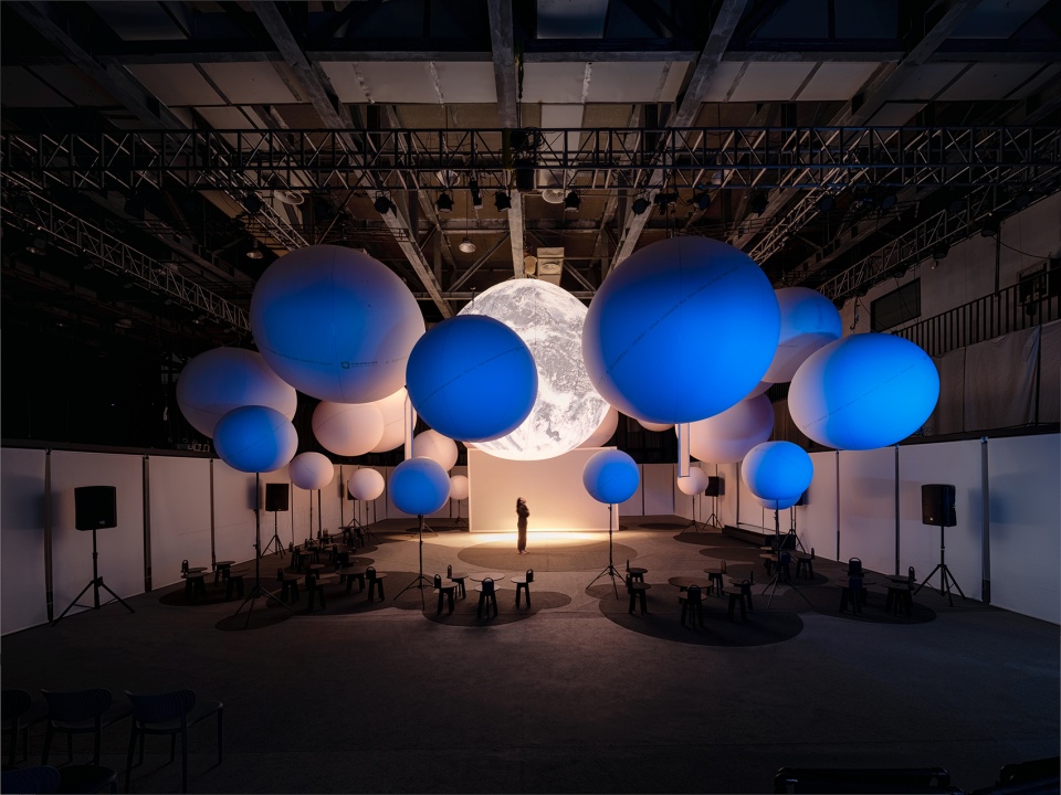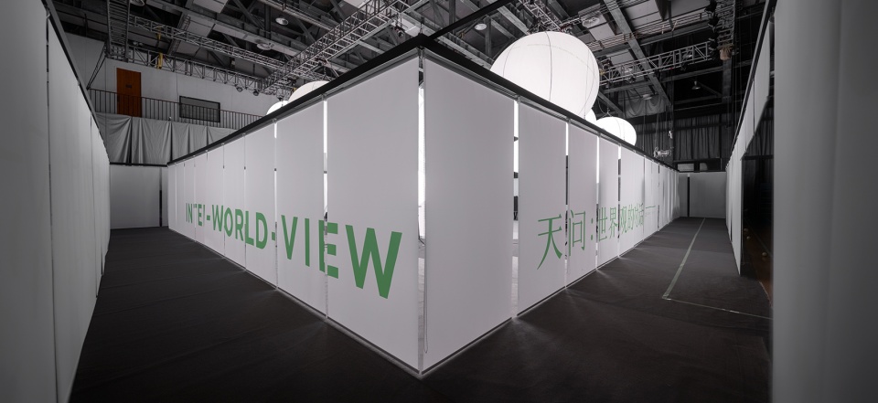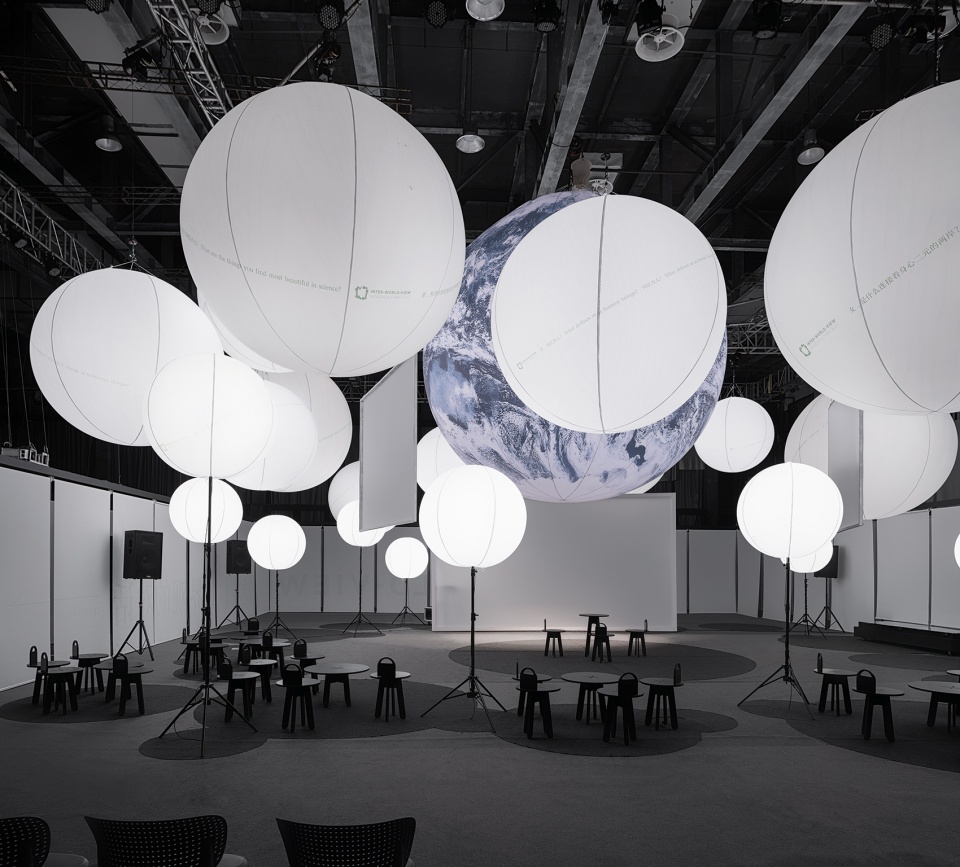展场的主体结构简单而清晰,它由中心的一只巨大蓝色星球、围绕其悬浮的十五只白球以及地面升起十三只白球组成,它们共同成为一个孤立于外部世界的离散系统。空中的二十八个白球代表着中国天文学中的二十八星宿,以地球为中心悬浮,分别以现实中的方位对应着二十八星宿的方位。它们在一个混沌系统中引力与斥力相互拉扯,平衡。每一时刻系统都处于稳恒态之中。