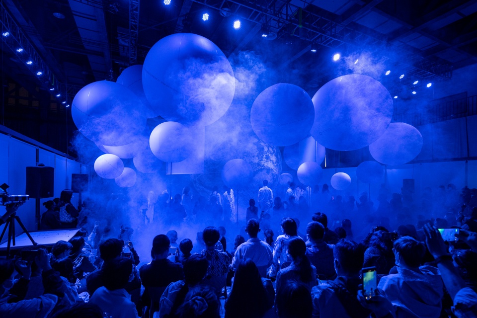 Twenty nine spheres are surrounded by a circle of corridor which have different widths. Sixteen spheres are hanging from the sky, and thirteen spheres are rising from the ground. People in the space is like fermions in different quantum states, shuttling and wandering in this space. Turn on the lights, the courtyard in the corridor becomes the scene of “heaven and earth echo, and the stars twinkled around the bright centre”. At the same time, the performance on the scene also uses the interaction between the main spheres and the three designed screens.