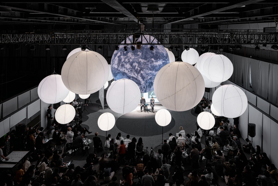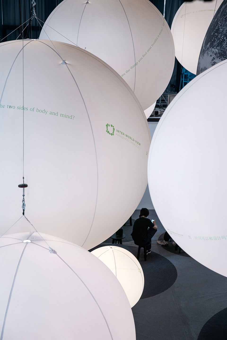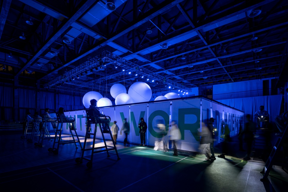 “天问:世界观的对话” (“世界青年科学家峰会”(WYSS)杭州分场,2020)举办于中国美术学院象山校区八号楼体育馆内。展览对话空间在设计之初规划为仅使用与占据一半体育馆的面积,剩余一半体育馆空间保留给学生的体育活动使用,两个半场之间则形成了一种有趣的空间使用方式的对比:一半空间给予脑力活动的发生,一半留给场馆原始承载的体育运动功能。